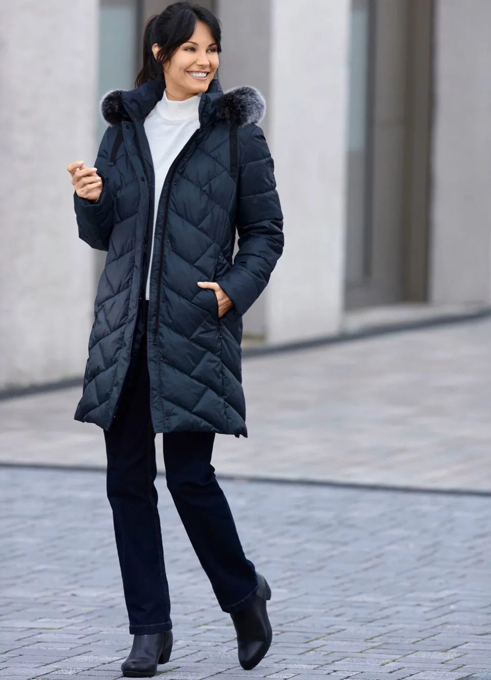 Geschmackvoller Kurzmantel mit Durchzugsband, Stopper und abnehmbarem Kunstpelz-Besatz an der abnehmbaren Kapuze, hoch schließbarem Stehkragen, Reißverschluss unter der verdeckten Druckerleiste, Reißverschluss an den Taschen und Seitenschlitzen, umschlagbaren Ärmeln sowie einer Innentasche. Länge ca. 90 cm.