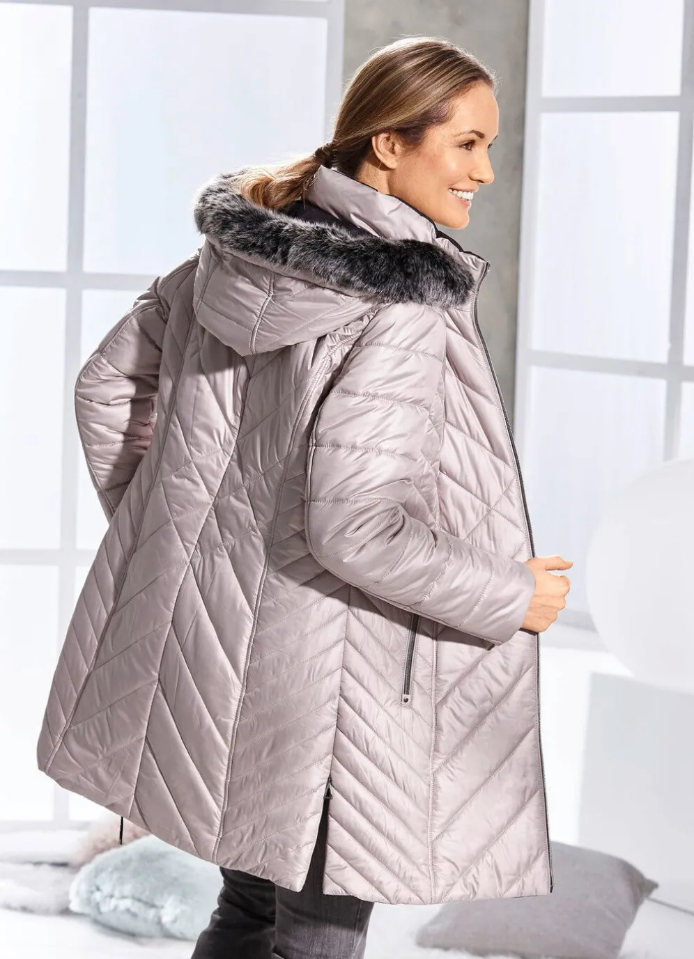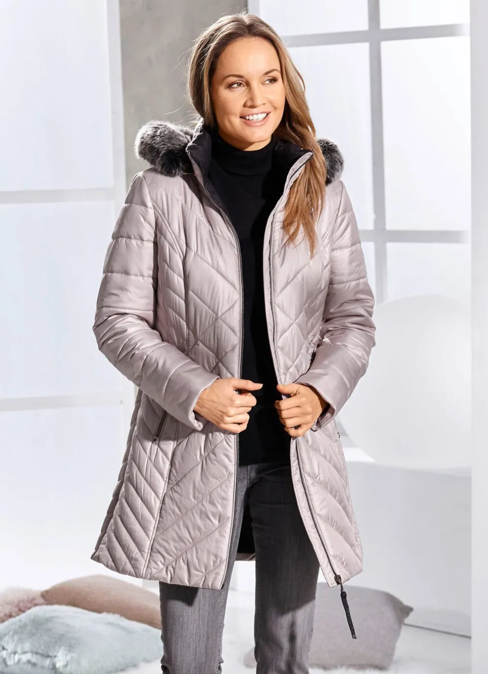 Klassischer Kurzmantel: abnehmbare Kapuze mit Durchzugsband, Stopper und abnehmbarem Kunstpelz-Besatz, durch Reißverschluss hoch schließbarer Stehkragen mit Flanell-Innenbeleg, Reißverschluss an Paspeltaschen und Seitenschlitzen, umschlagbare Ärmel sowie eine Innentasche. Länge ca. 88 cm.