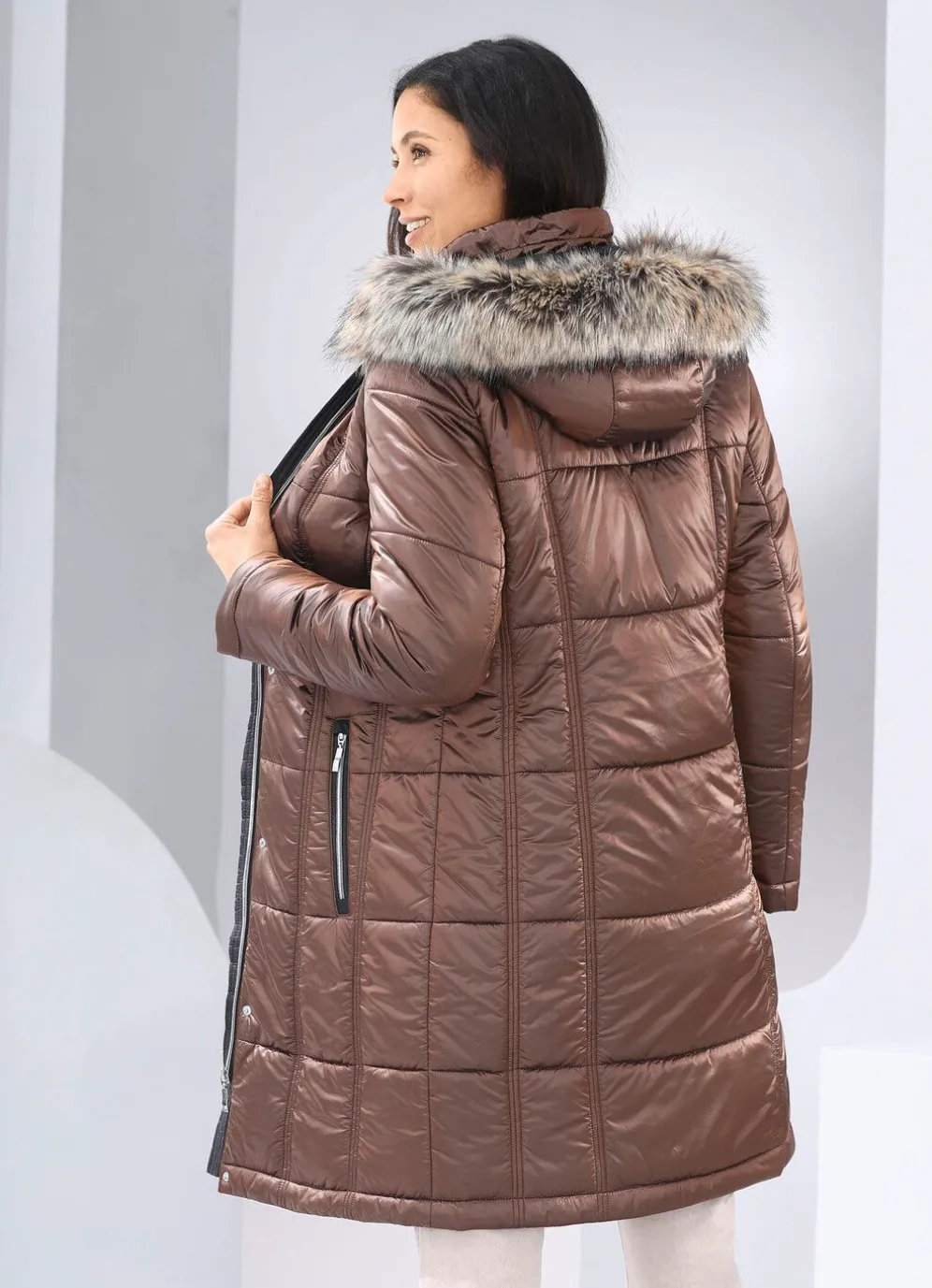 Für echtes Modevergnügen steht dieser nugatfarbene Kurzmantel: abnehmbare Kapuze mit Durchzugsband, Stopper und abnehmbarem Kunstpelz-Besatz, durch Reißverschluss unter der Druckerleiste hoch schließbarer Stehkragen, Reißverschluss an den Paspeltaschen sowie eine Innentasche. Länge ca. 95 cm.