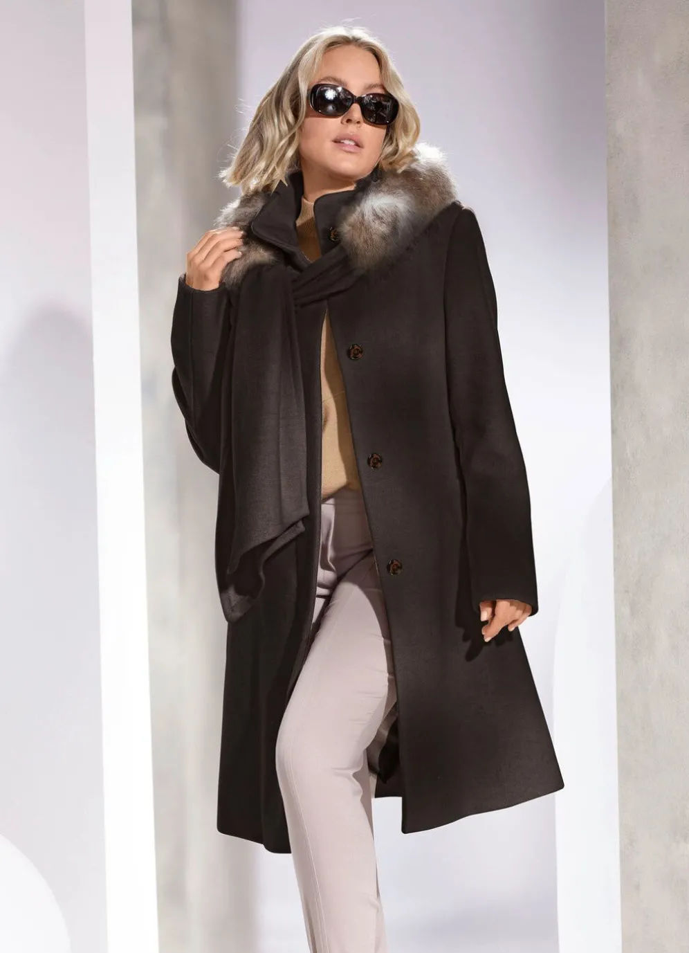 Für alle, die das Besondere lieben ist dieser Kurzmantel genaus das Richtige! Freuen Sie sich auf das Modell mit Knopfverschluss am Stehkragen, verdeckter Knopfleiste, Schubtaschen mit Blende, abnehmbarem Kunstpelz-Besatz am abnehmbaren Schal sowie einer Innentasche. Länge ca. 97 cm.