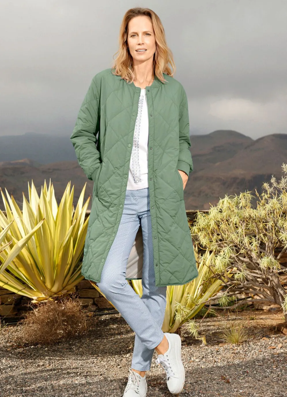 Leicht taillierter Kurzmantel mit rundem Halsausschnitt, Druckerleiste, Rippbündchen an den langen Ärmeln, Schubtaschen sowie komfortablen Druckern an den Seitenschlitzen. Länge ca. 106 cm.