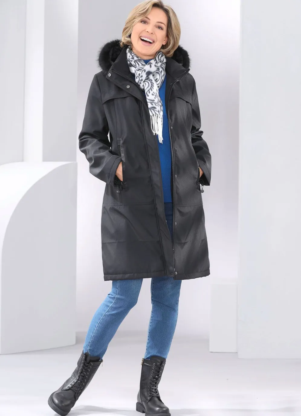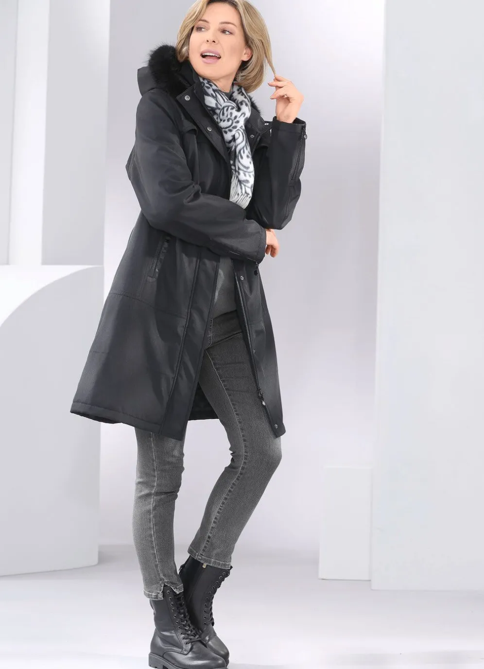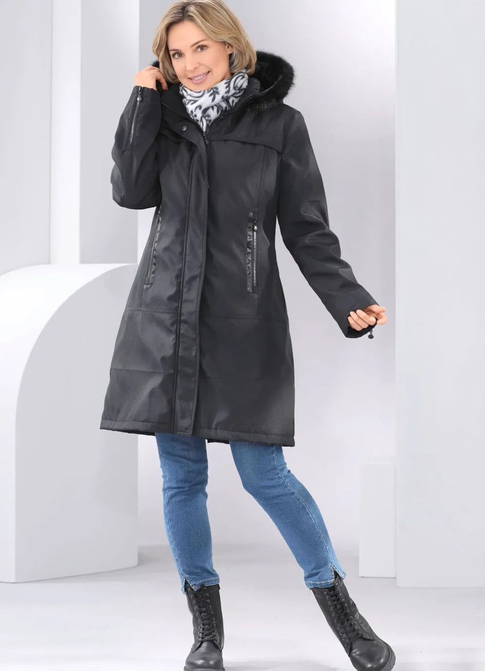- abnehmbare Kapuze mit festem Kunstpelz-Besatz