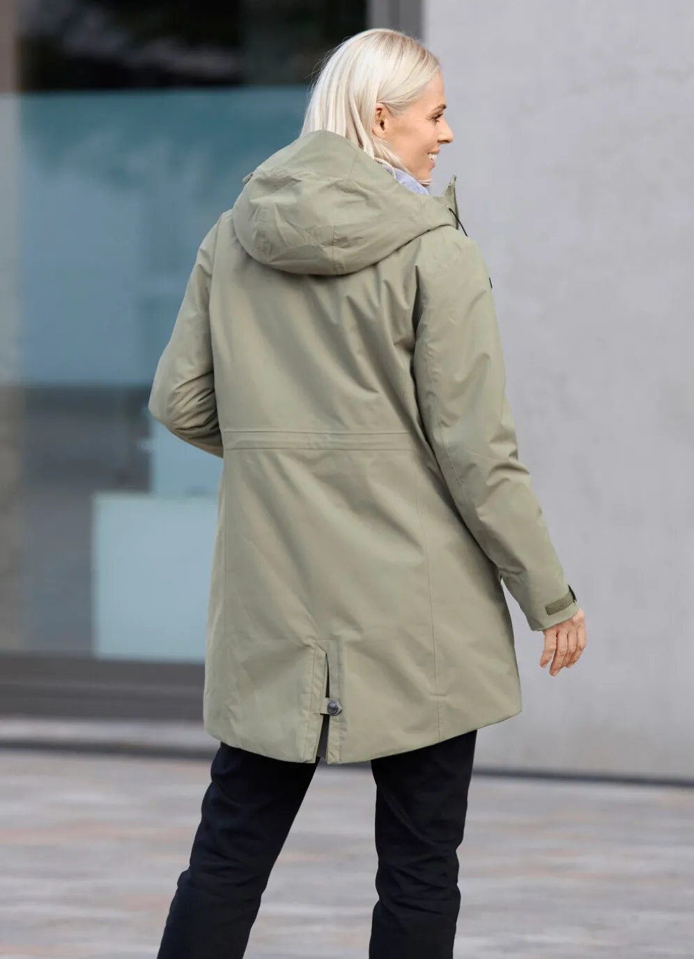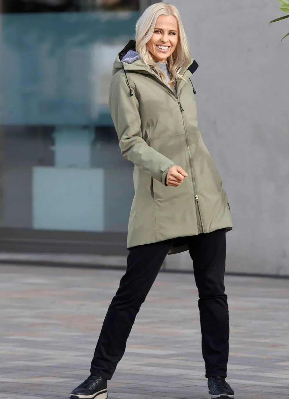 Hervorragender Kurzmantel mit Durchzugsband, Regenschild und Kunstpelz-Innenausstattung in der angeschnittenen Kapuze, hoch schließbarem Stehkragen, 2-Wege-Reißverschluss, verdeckten Reißverschlusstaschen, weitenreguliererbarem Riegel mit Klett an den Ärmelabschlüssen, einer Innentasche sowie Schlitz mit Riegel und Drucker im leicht verlängerten, abgerundeteten Rückteil. Länge ca. 93 cm, ab Gr. 42 ca. 96 cm, ab Gr. 50 ca. 99 cm.