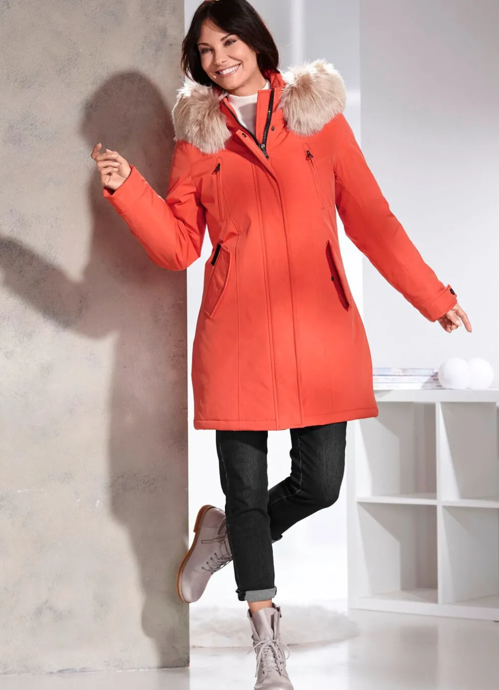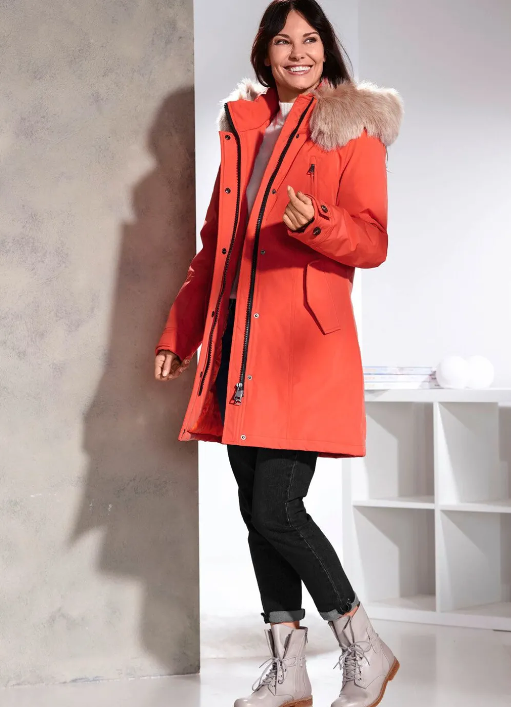 Fantastischer Kurzmantel in Koralle, mit vielen Details: durch Riegel und Schnalle größenverstellbare, abnehmbare Kapuze mit Durchzugsband, Stopper und abnehmbarem Kunstpelz-Besatz, durch 2-Wege-Reißverschluss unter verdeckter Druckerleiste hoch schließbarer Stehkragen, Reißverschluss- Brusttaschen, Schubtaschen mit Patte und verdecktem Drucker, verstellbarer Riegel mit Knopf an den Abschlüssen der Ärmel mit Windfang aus Rippenstrick sowie eine Innentasche. Länge ca. 88 cm, bei Gr. M ca. 90 cm, bei Gr. L ca. 92 cm, bei Gr. XL ca. 94 cm.