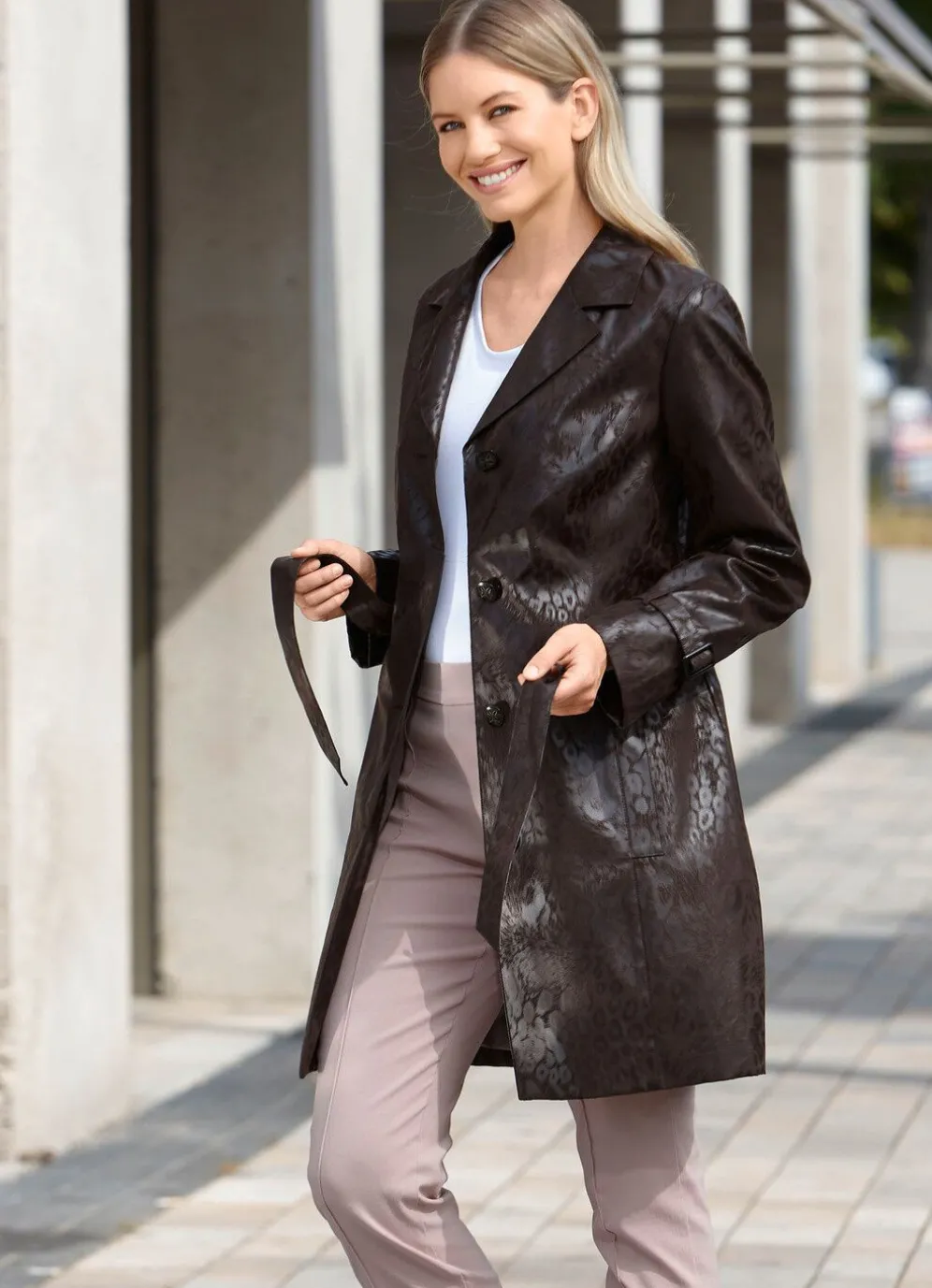 Perfekt und absolut im Trend ist dieser schokobraune Kurzmantel mit attraktivem Raubtierfell-Dessin, Reverskragen, Knopfleiste, Gürtelschlaufen, Bindegürtel, Blende an den Schubtaschen, Riegel und Schnalle an den Ärmelabschlüssen, einer Innentasche sowie verdecktem Gehschlitz im Rückteil. Länge ca. 90 cm.