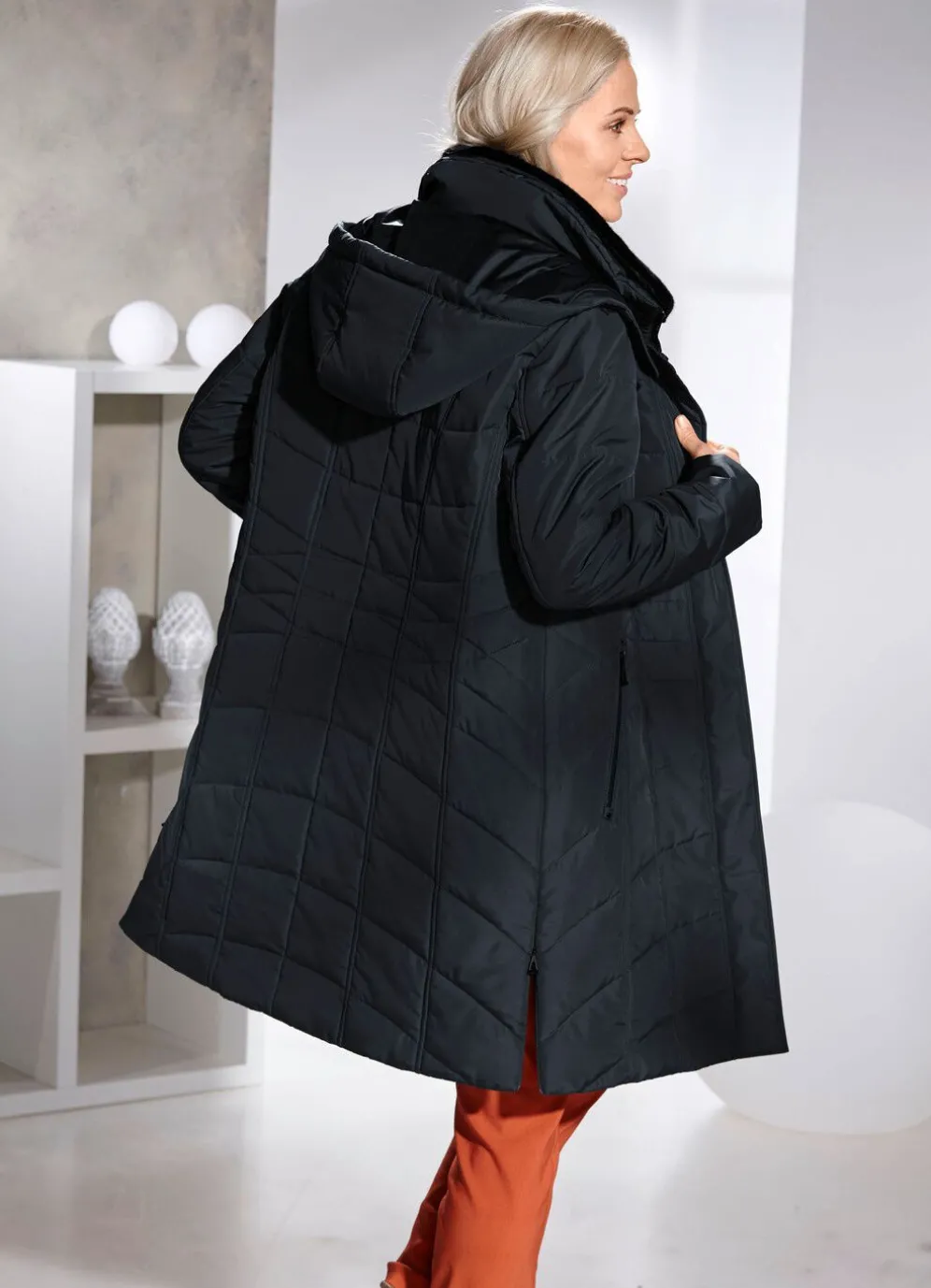 Kurzmantel mit hohem Tragekomfort: abnehmbare Kapuze mit Durchzugsband, Stopper, Riegel und Druckern, durch Reißverschluss unter der verdeckten Druckerleiste hoch schließbarer Stehkragen mit abnehmbarem Kunstpelz-Besatz, Reißverschluss an den Taschen und Seitenschlitzen, umschlagbare Ärmel sowie eine Innentasche. Länge ca. 94 cm.