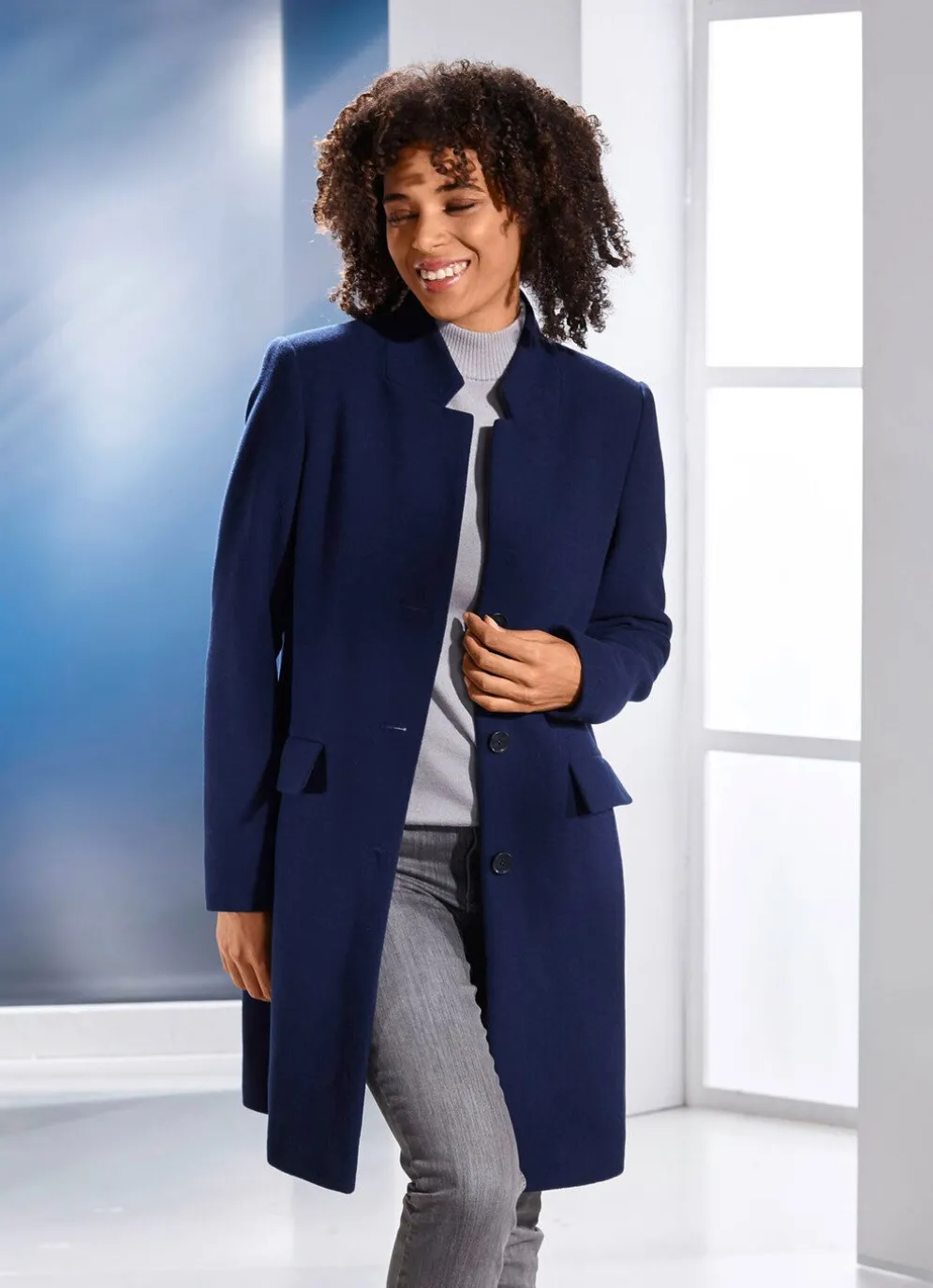 Kurzmantel mit Kelchkragen, Knopfleiste sowie Pattentaschen. Länge ca. 92 cm.