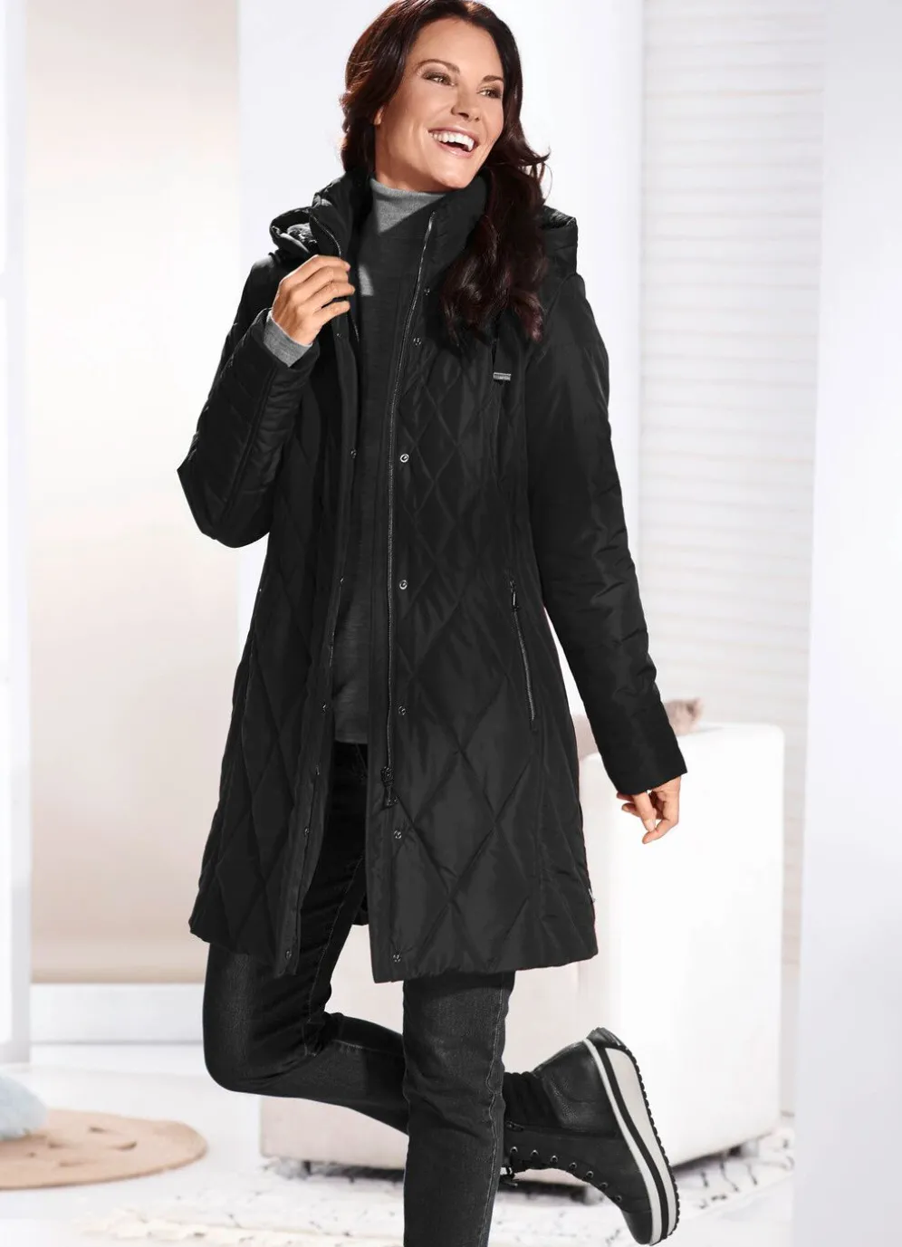 Fabelhaft femininer Kurzmantel mit Durchzugsband und Stopper an der abnehmbaren Kapuze mit Kunstpelz-Innenausstattung, durch Reißverschluss unter verdeckter Druckerleiste hoch schließbarem Stehkragen, Reißverschluss an den Taschen und Seitenschlitzen sowie einer Innentasche. Länge ca. 90 cm.