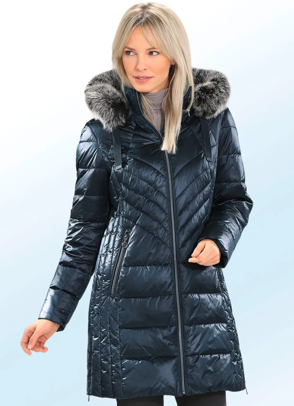 Besonders bequem zu tragen ist dieser flotte Kurzmantel mit seitlich figurfreundlicher Längssteppung, Durchzugsband, Stopper und abnehmbarem Kunstpelz-Besatz an der abnehmbaren Kapuze, durch Reißverschluss hoch schließbarem Stehkragen, Reißverschluss an Paspeltaschen und Seitenschlitzen, umschlagbaren Ärmeln sowie einer Innentasche. Länge ca. 88 cm.