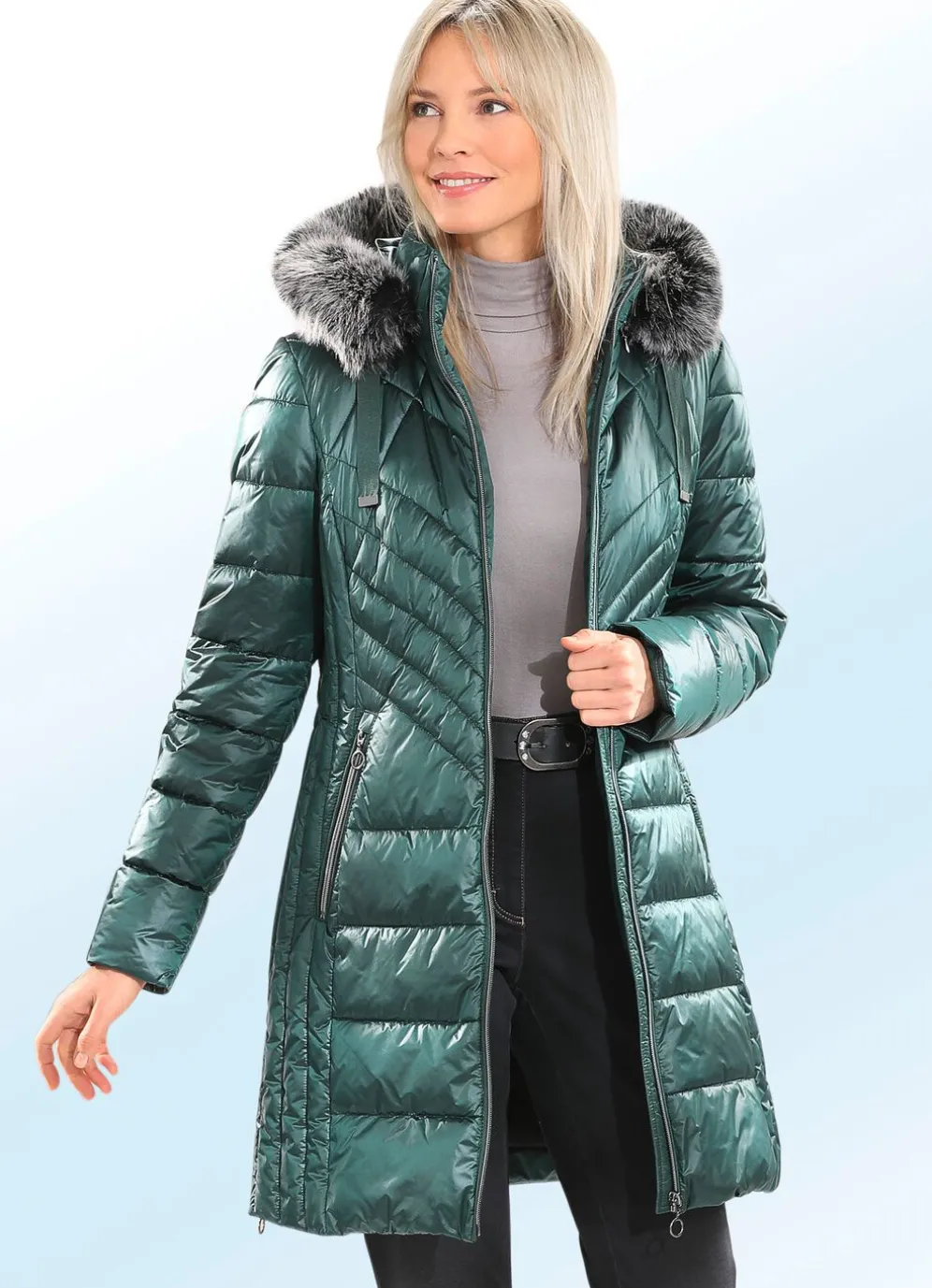 Besonders bequem zu tragen ist dieser flotte Kurzmantel mit seitlich figurfreundlicher Längssteppung, Durchzugsband, Stopper und abnehmbarem Kunstpelz-Besatz an der abnehmbaren Kapuze, durch Reißverschluss hoch schließbarem Stehkragen, Reißverschluss an Paspeltaschen und Seitenschlitzen, umschlagbaren Ärmeln sowie einer Innentasche. Länge ca. 88 cm.