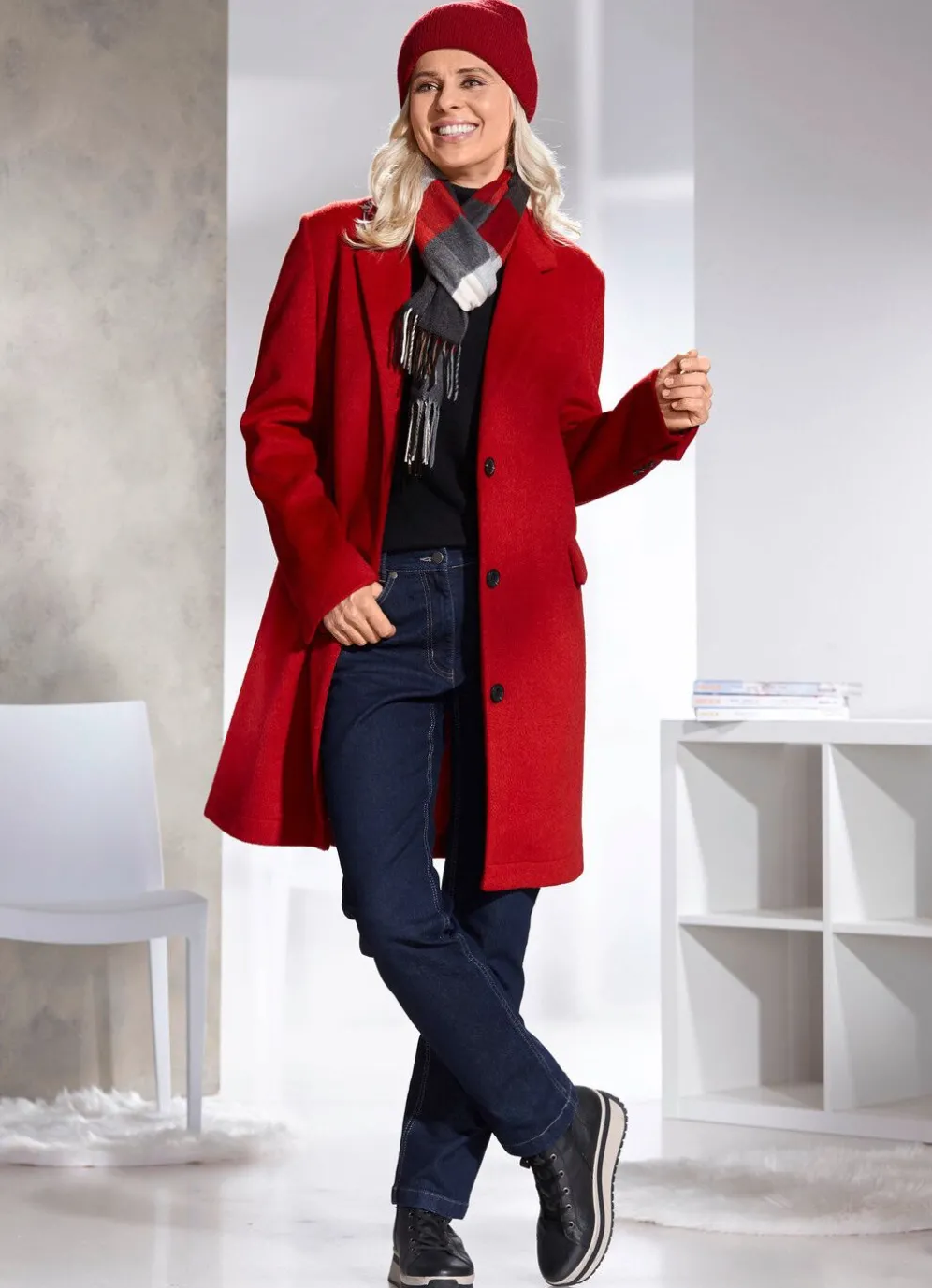 Karminroter Kurzmantel mit Reverskragen, Knopfleiste, Zier-Brusttasche, Patte an den Taschen, Knöpfen an den Ärmelabschlüssen sowie verdecktem Gehschlitz. Länge ca. 93 cm.