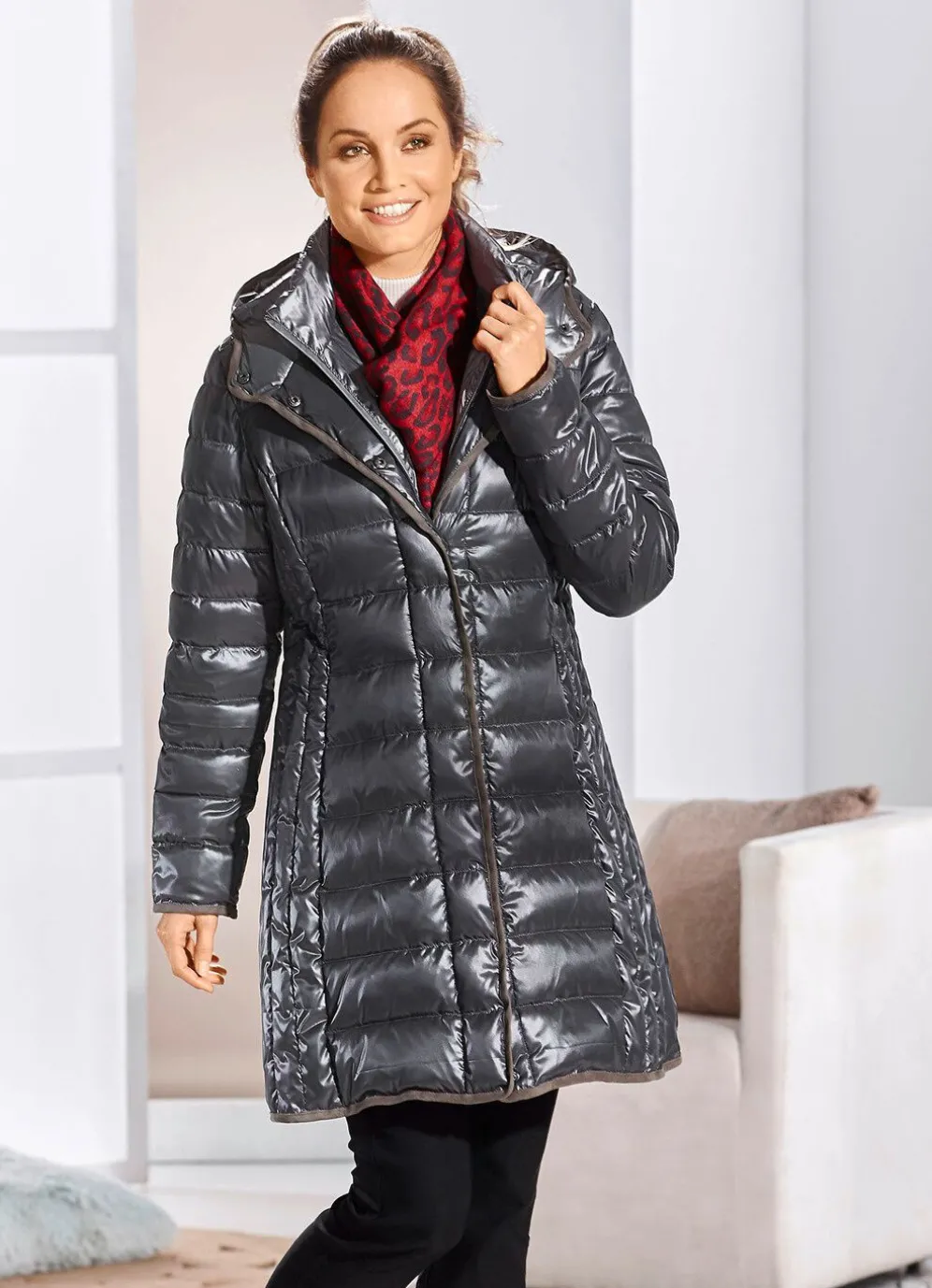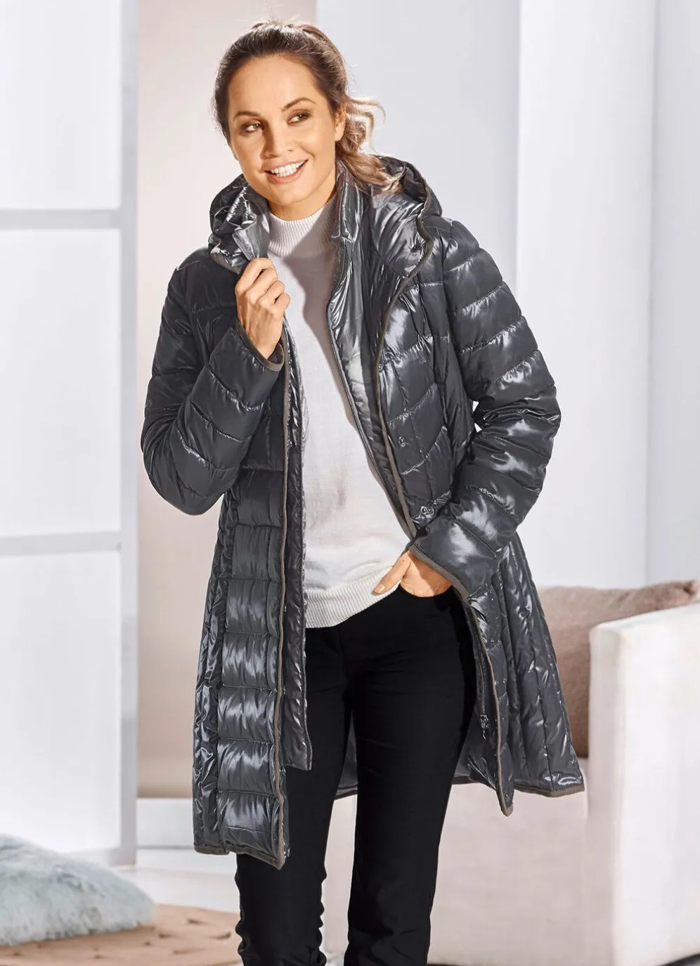 Für Ihren glanzvollen Auftritt! Kurzmantel in Grafit, mit figurschmeichelnder, seitlicher Längssteppung: feste Kapuze mit Durchzugsband und Stopper, durch Reißverschluss hoch schließbarer Stehkragen am festen Westeneinsatz, verdeckte Druckerleiste sowie nahtfeine Reißverschlusstaschen. Länge ca. 92 cm.