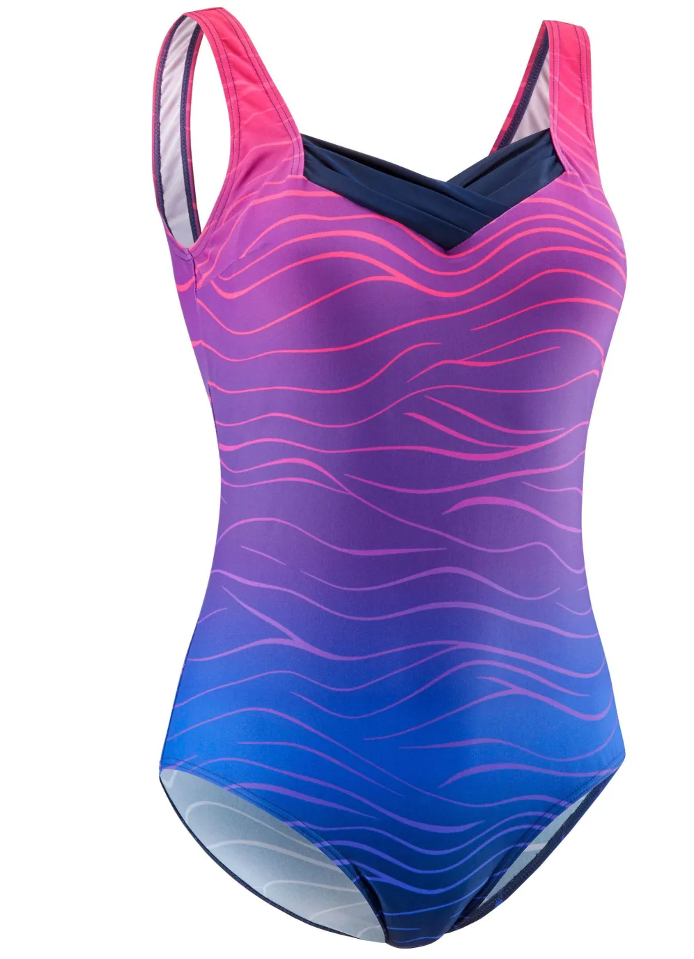 Allover dessinierter „Laurina“-Badeanzug in Marine-Pink-Lila, mit dekorativer Ausschnittblende, Halbkorsage, Softschalen sowie Unterbrustband.