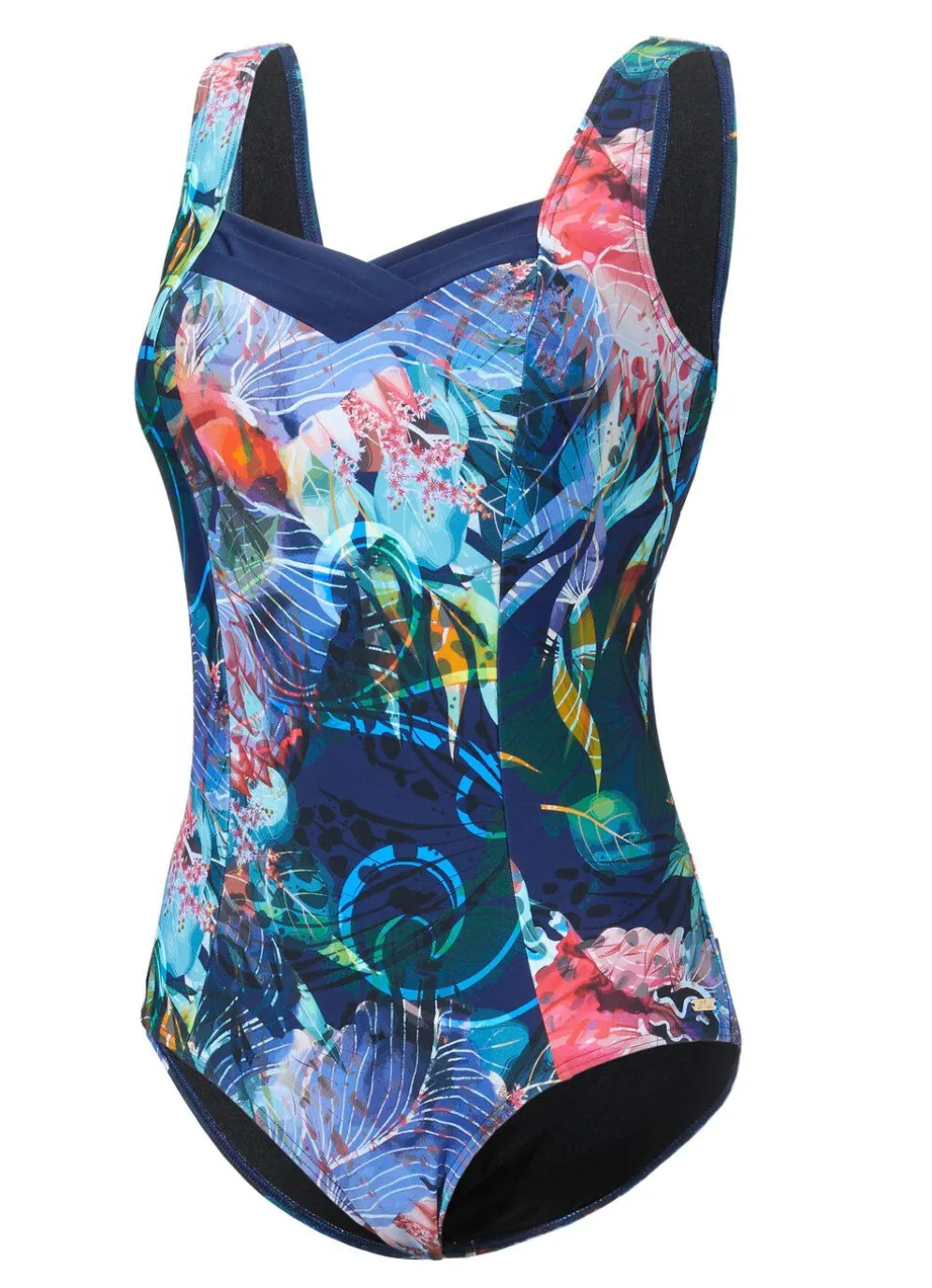 Attraktiver „Laurina“-Badeanzug in Marine-Bunt, mit kleiner Ausschnittblende, Halbkorsage, Softschalen sowie Unterbrustband.
