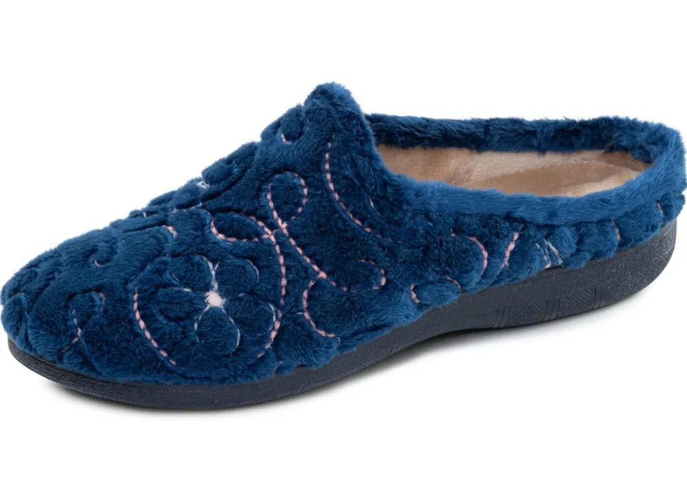 Hausschuhe von „Laurina“, aus flauschigem Textilmaterial mit kontrastfarbener Blumen-Stickerei: Futter und Decksohle aus gepolstertem Samt, leichte Gummi-Laufsohle sowie 15 mm Keilabsatz