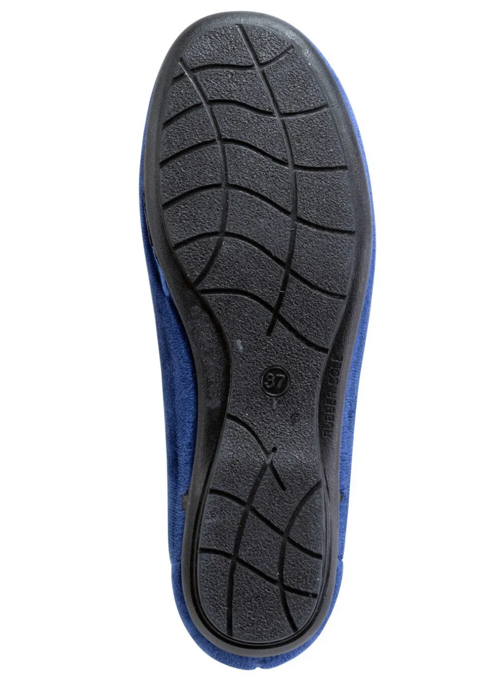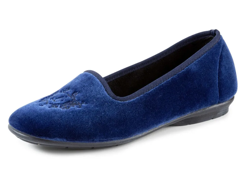 Royalblauer „Laurina“-Haus-Ballerina aus edel schimmerndem Samt, mit stilvoller Stickerei: Futter und gepolsterte Decksohle aus Textil, superleichte Gummi-Laufsohle sowie 10 mm Keilabsatz