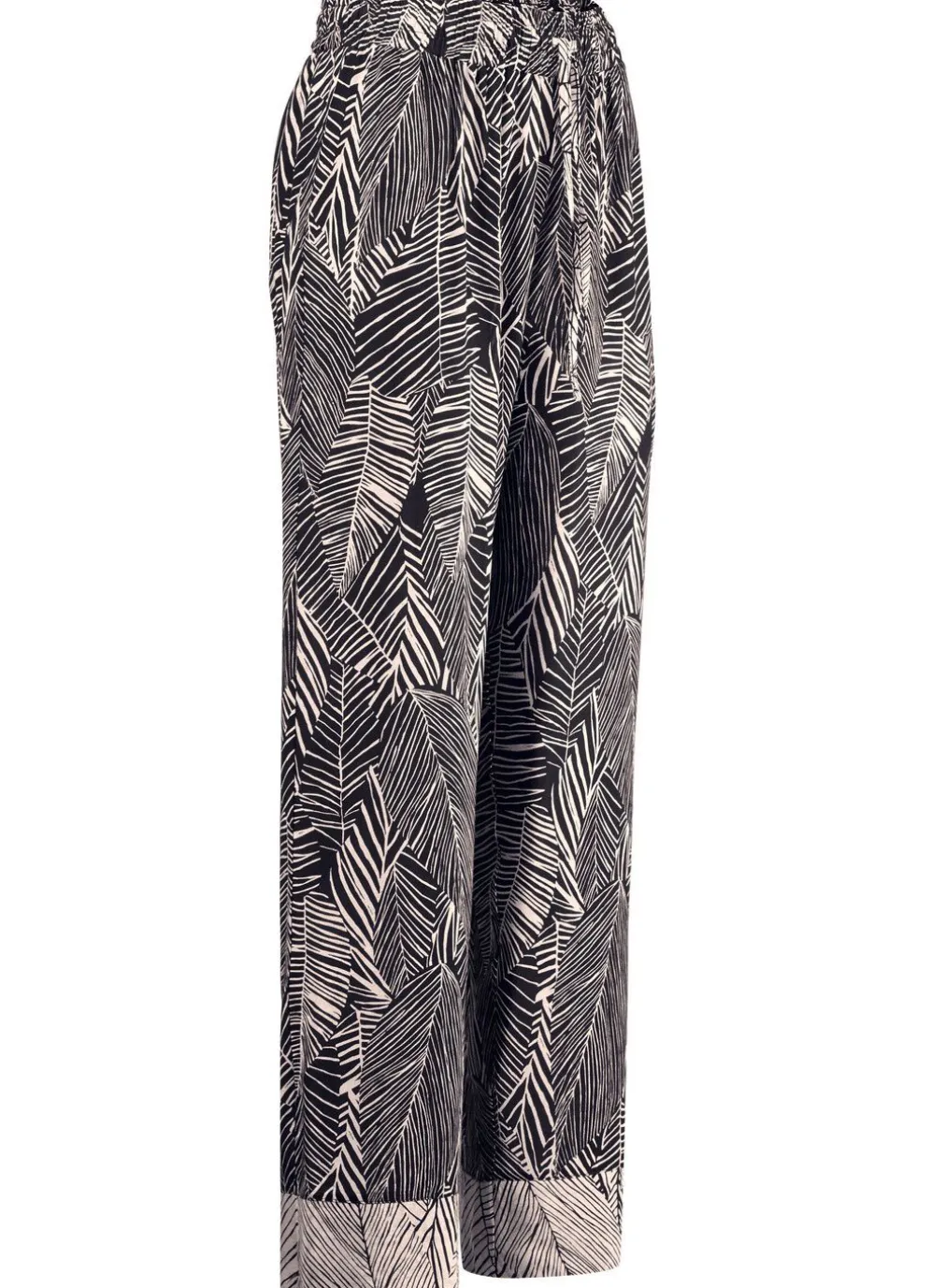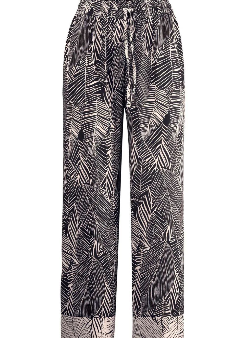 Superbequeme „Laurina“-Hose in Schwarz-Ecru, allover dessiniert, mit Durchzugsband im Dehnbund sowie Kontrastblenden an den Beinabschlüssen. Innenbeinlänge ca. 76 cm.