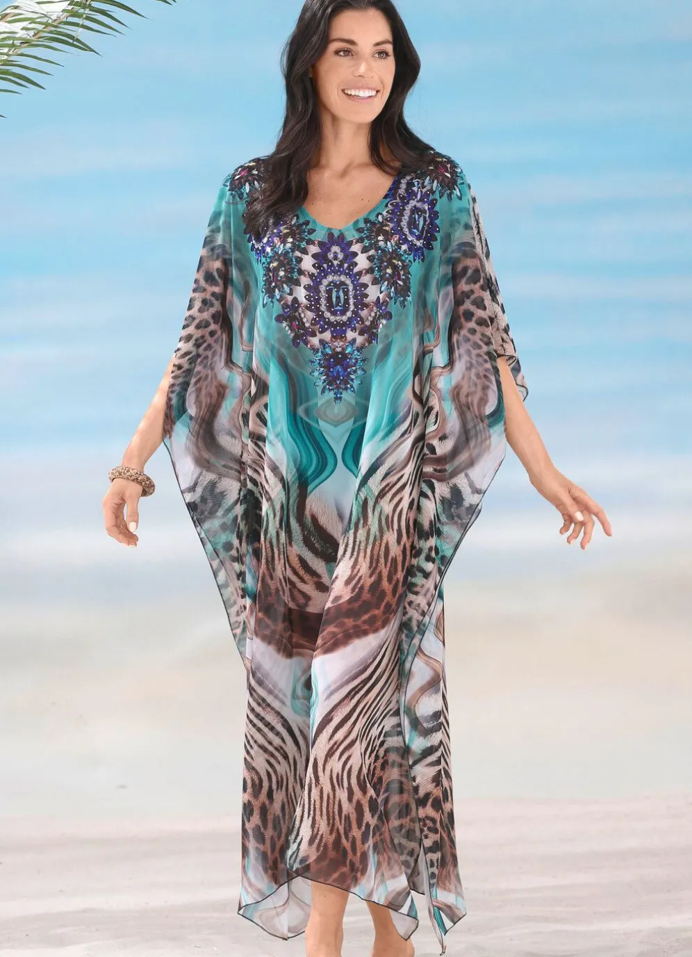 Kaftan von „Laurina“: eindrucksvoll in Türkis-Braun allover dessiniert, mit effektvollen Schmucksteinchen im Vorderteil. Länge ca. 130 cm.