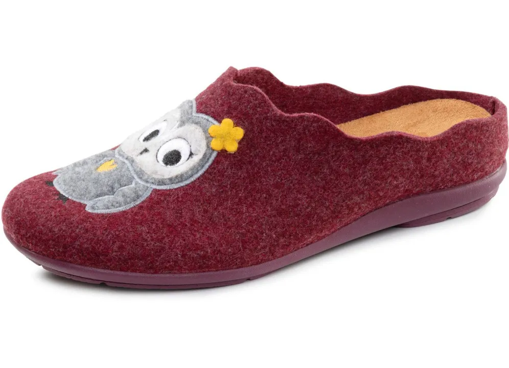 Hausschuhe von „Laurina“, aus Filz mit niedlicher Eulen-Applikation: herausnehmbares Textil-Fußbett, superleichte Gummi-Laufsohle sowie 10 mm Keilabsatz