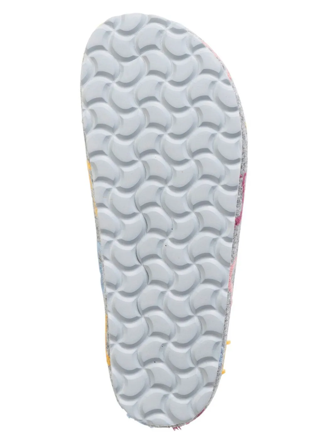 Hausschuhe von „Laurina“ aus grauem Filz mit bunter Herzchen-Stickerei: Weite H, Futter und anatomisches Fußbett aus Filz, leichte EVA-Profilsohle mit flachem Keilabsatz