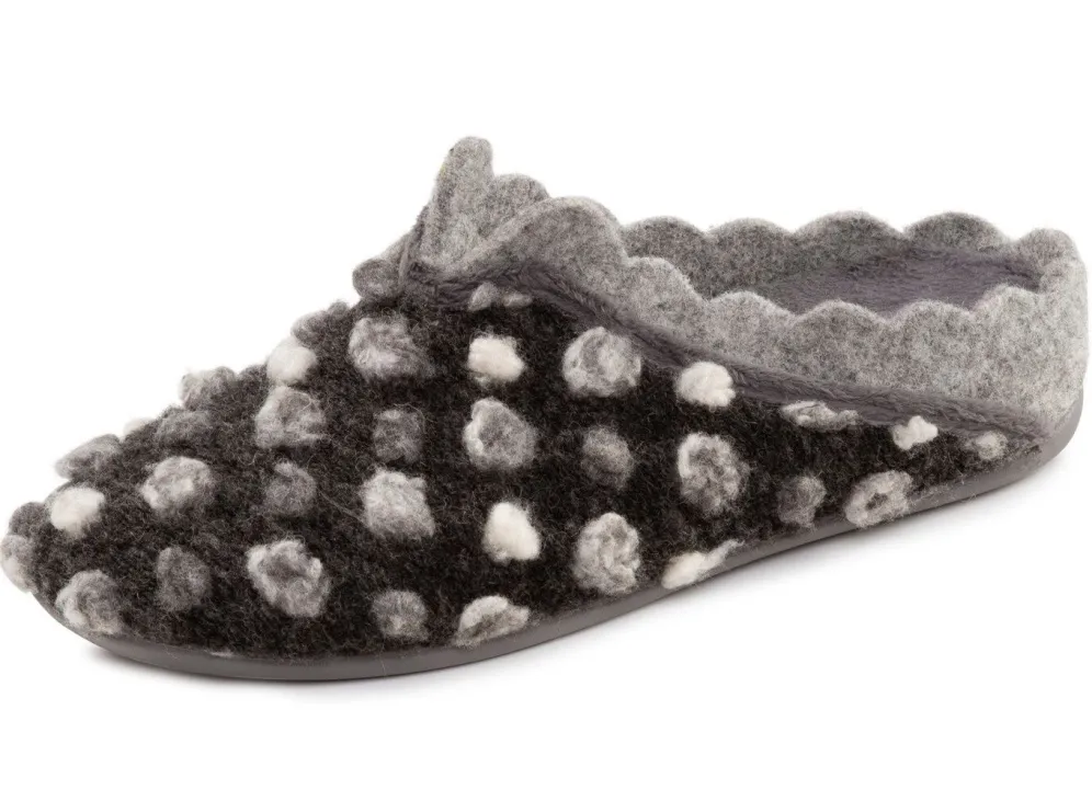 Hausschuhe von „Laurina“, aus Filz mit Pünktchen-Dessin: Textilfutter, herausnehmbares Fußbett, leichte Gummi-Laufsohle sowie 10 mm Keilabsatz