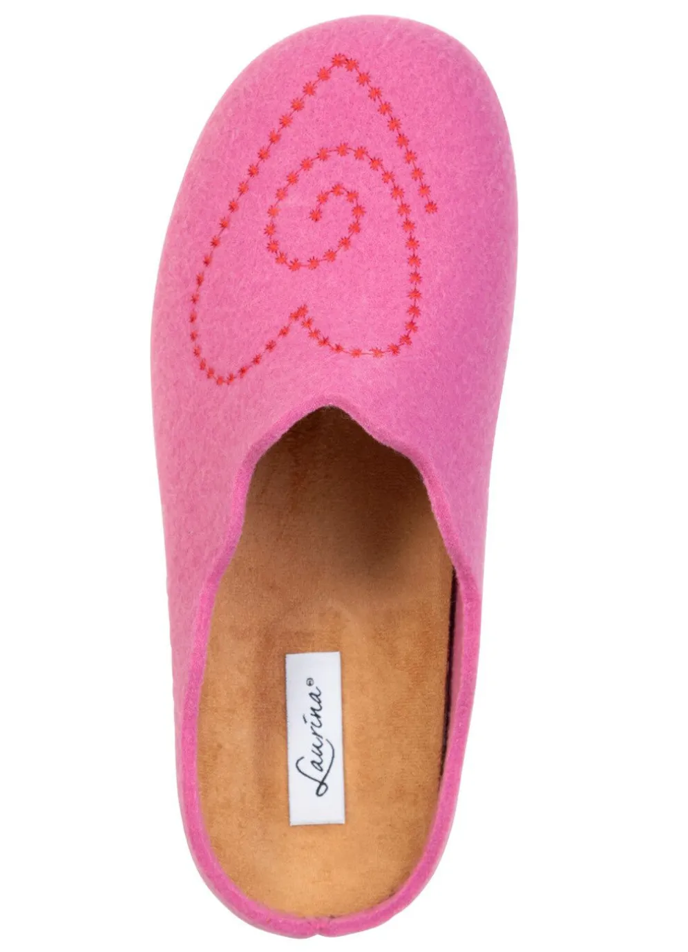 Hausschuhe von Laurina aus Filzmaterial mit hübscher, roter Herz-Stickerei: herausnehmbares Fußbett, Gummi-Laufsohle sowie 15 mm Keilabsatz