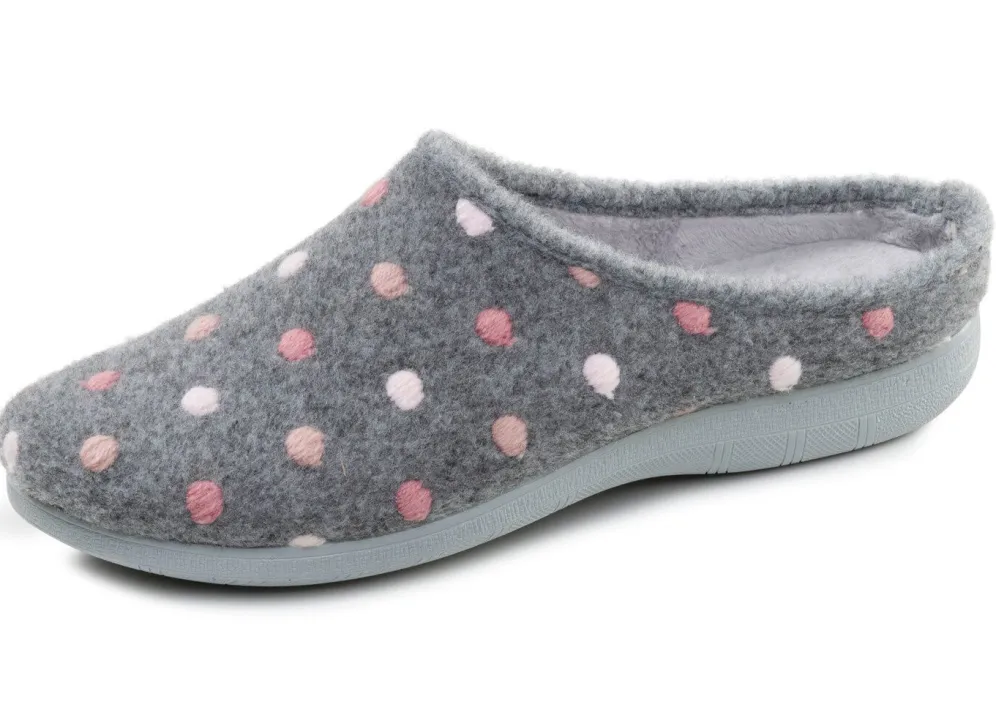 Hausschuhe von Laurina aus Textilmaterial mit bunter Pünktchen-Stickerei: Futter und gepolsterte Decksohle aus weichem Samt, leichte Gummi-Laufsohle sowie 15 mm Keilabsatz