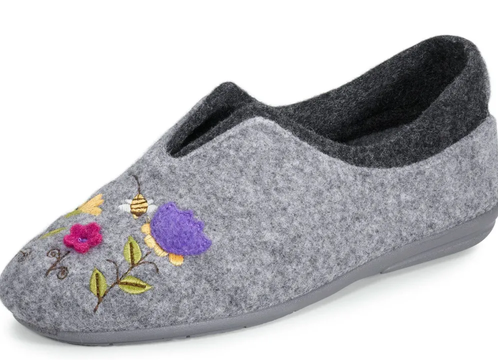 Hausschuhe von Laurina, aus Filz mit fantasievoller Motiv-Stickerei: in Weite G, gepolsterte Decksohle, leichte Gummi-Laufsohle sowie 15 mm Keilabsatz