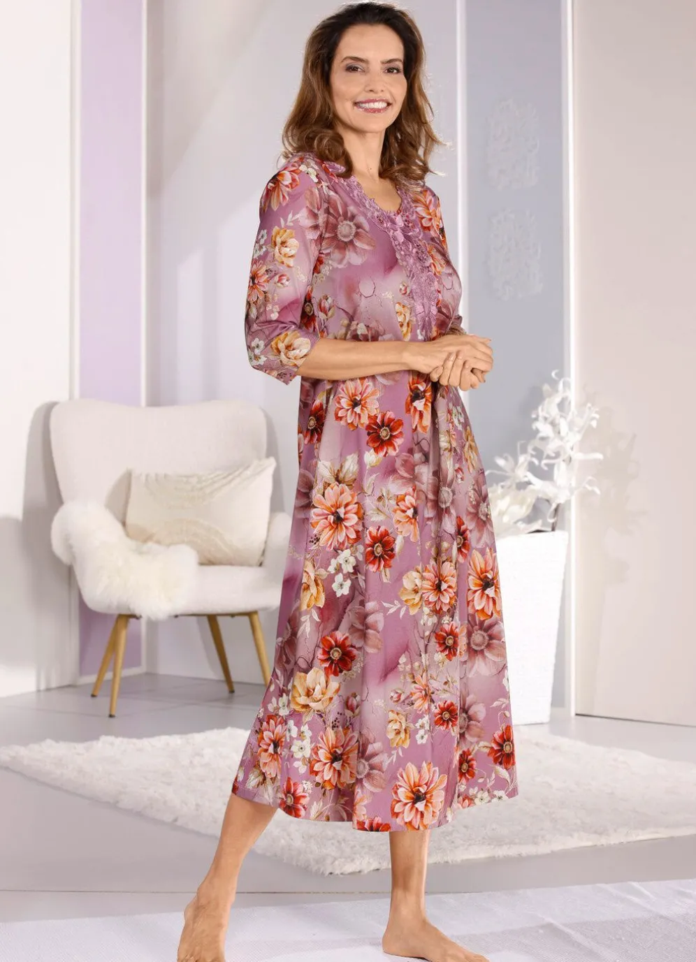 Knöchellanges „Laurina”-Nachthemd mit farbbrillantem Druckdessin in Rosenquarz-Bunt, großzügiger