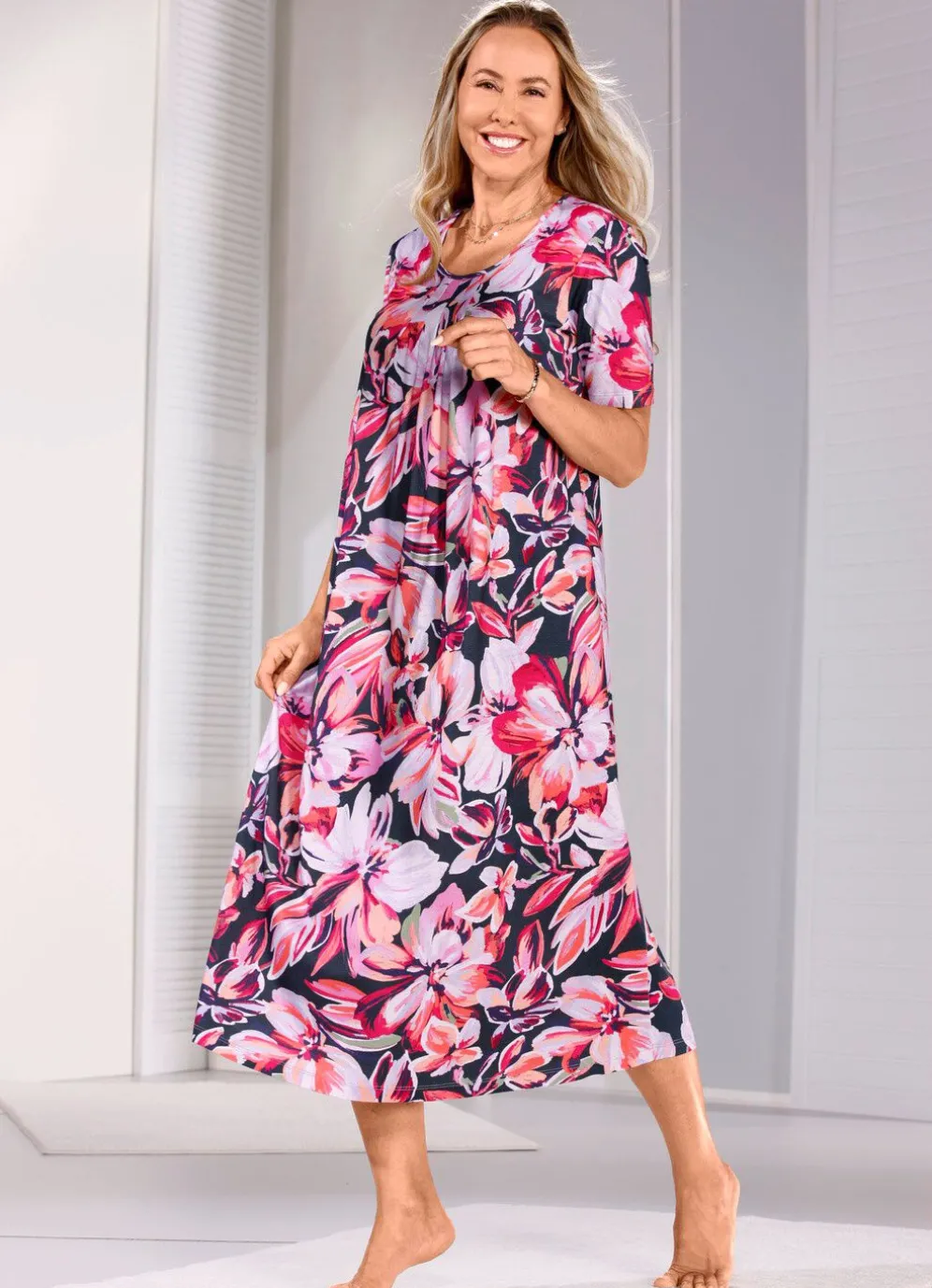 Zauberhaftes, knöchellanges „Laurina”-Nachthemd in Schwarz-Pink-Bunt, mit Absteppung und