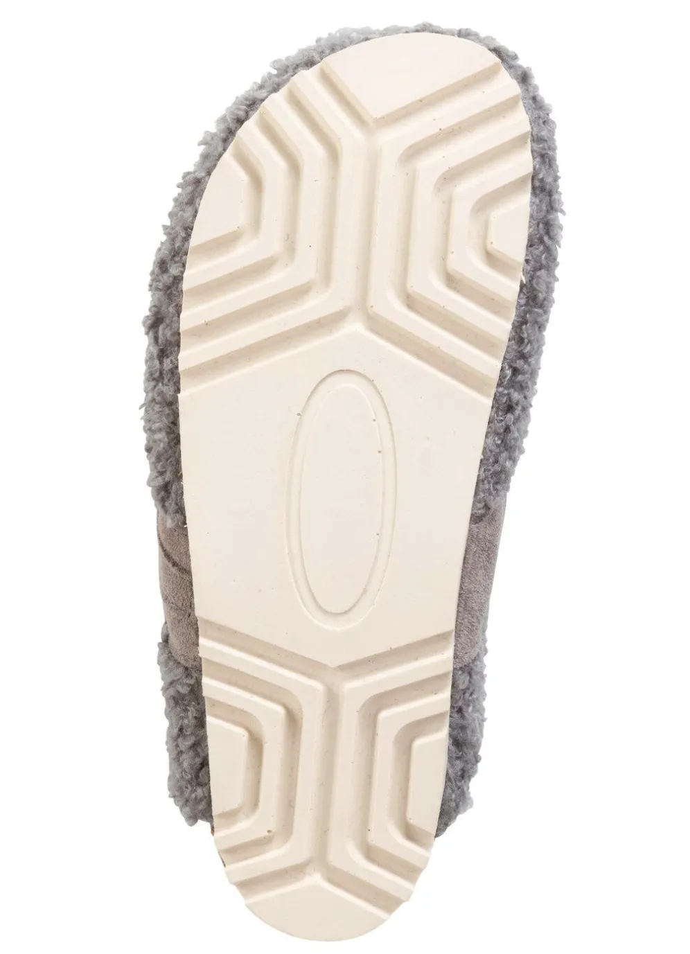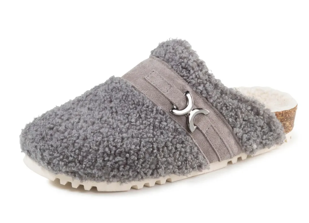 „Laurina“-Pantoffel aus weichem Plüsch mit Veloursbesatz: Weite H, anatomisches Kork-Textilfußbett sowie flache PU-Profilsohle