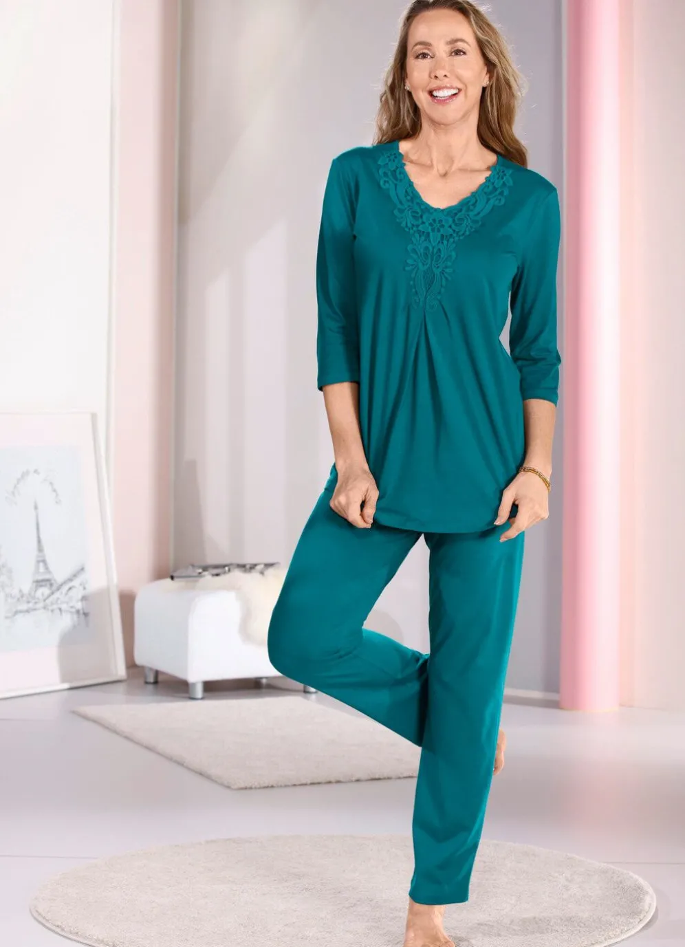 Aparter, petrolfarbener Schlafanzug von „Laurina“! Oberteil mit großzügiger Motivspitze,
