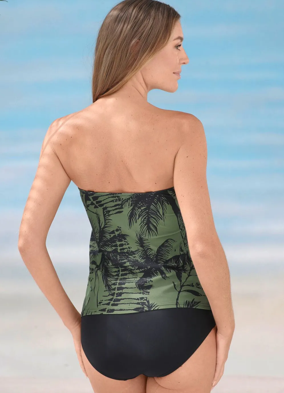 „Laurina“-Tankini in Bandeauform: Oberteil mit Druckdessin in Oliv-Schwarz, Raffung in der Büstenmitte, verstell- und abnehmbaren Trägern sowie Softschalen und Unterbrustband. Schwarzes Höschen mit Vorderfutter.