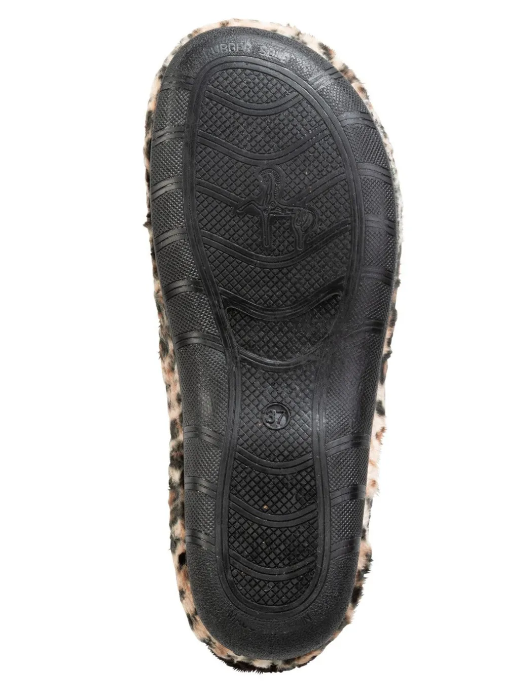Hausschuhe von „Laurina“ in Braun-Schwarz, aus flauschigem Kunstfell mit rassigem Leoparden-Dessin: Futter und Decksohle aus gepolstertem Samt, leichte Gummi-Laufsohle sowie 10 mm Keilabsatz