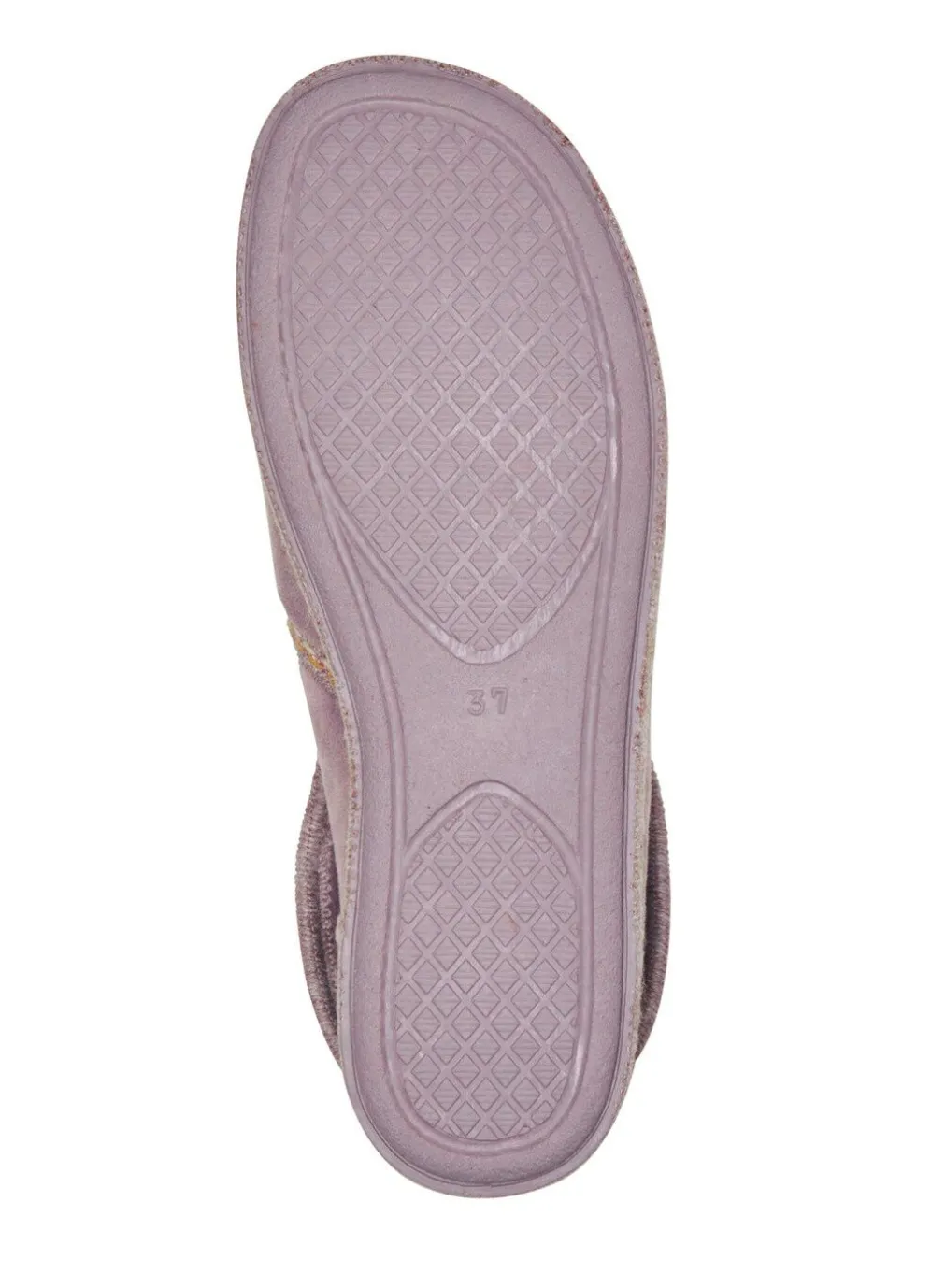 Hausschuhe von „Laurina“, aus samtigem Textil, mit hübscher Bordüre: zwei seitliche Gummizüge, flauschiger Kragen, Warmfutter und Decksohlenbezug aus 100% Schurwolle, leichte Gummi-Riffelsohle