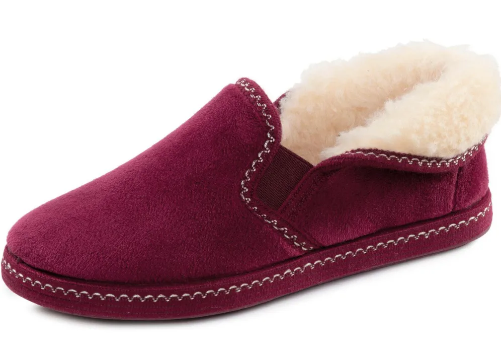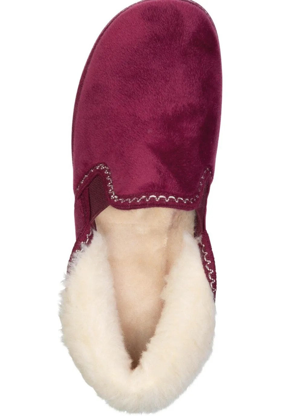 Hausschuhe von „Laurina“, aus samtigem Textil, mit hübscher Bordüre: zwei seitliche Gummizüge, flauschiger Kragen, Warmfutter und Decksohlenbezug aus 100% Schurwolle, leichte Gummi-Riffelsohle