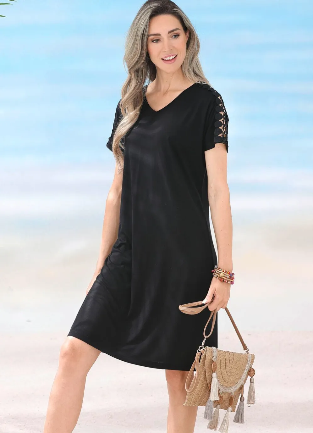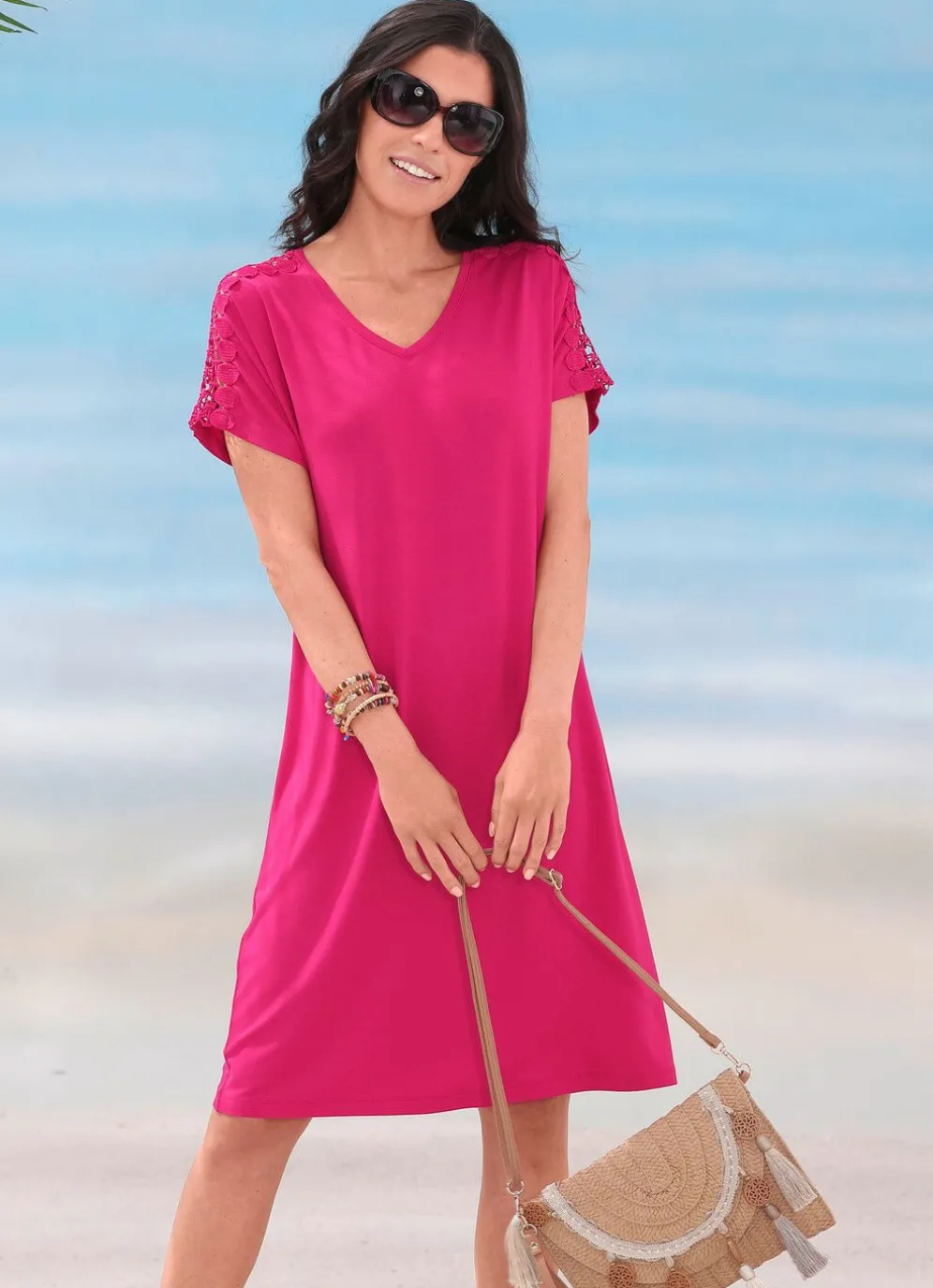„Laurina“-Kleider im vorteilhaften Zweierpack: unifarben mit Stickereispitze im Schulterbereich und an den kurzen Ärmeln. Länge ab 98 cm.