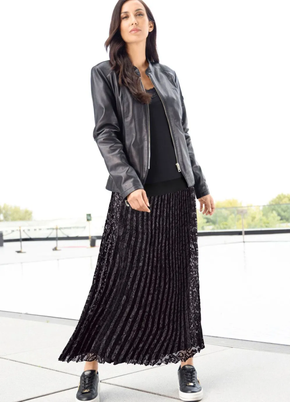 Schwarze Lederkurzjacke von „Cabrini” aus angenehm weichem Lamm-Nappaleder. Mit Stehkragen, durchgehendem Reißverschluss, Taschen mit Reißverschluss, zwei Innentaschen, Ziernähten an den Schultern, Emblem am linken Ärmel, Ärmelabschlüssen mit Reißverschluss.