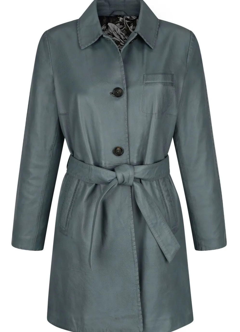 Mit Umlegekragen, einer Brusttasche, Knopfleiste, Gürtelschlaufen, Bindegürtel, Seitentaschen sowie Rückenschlitz.