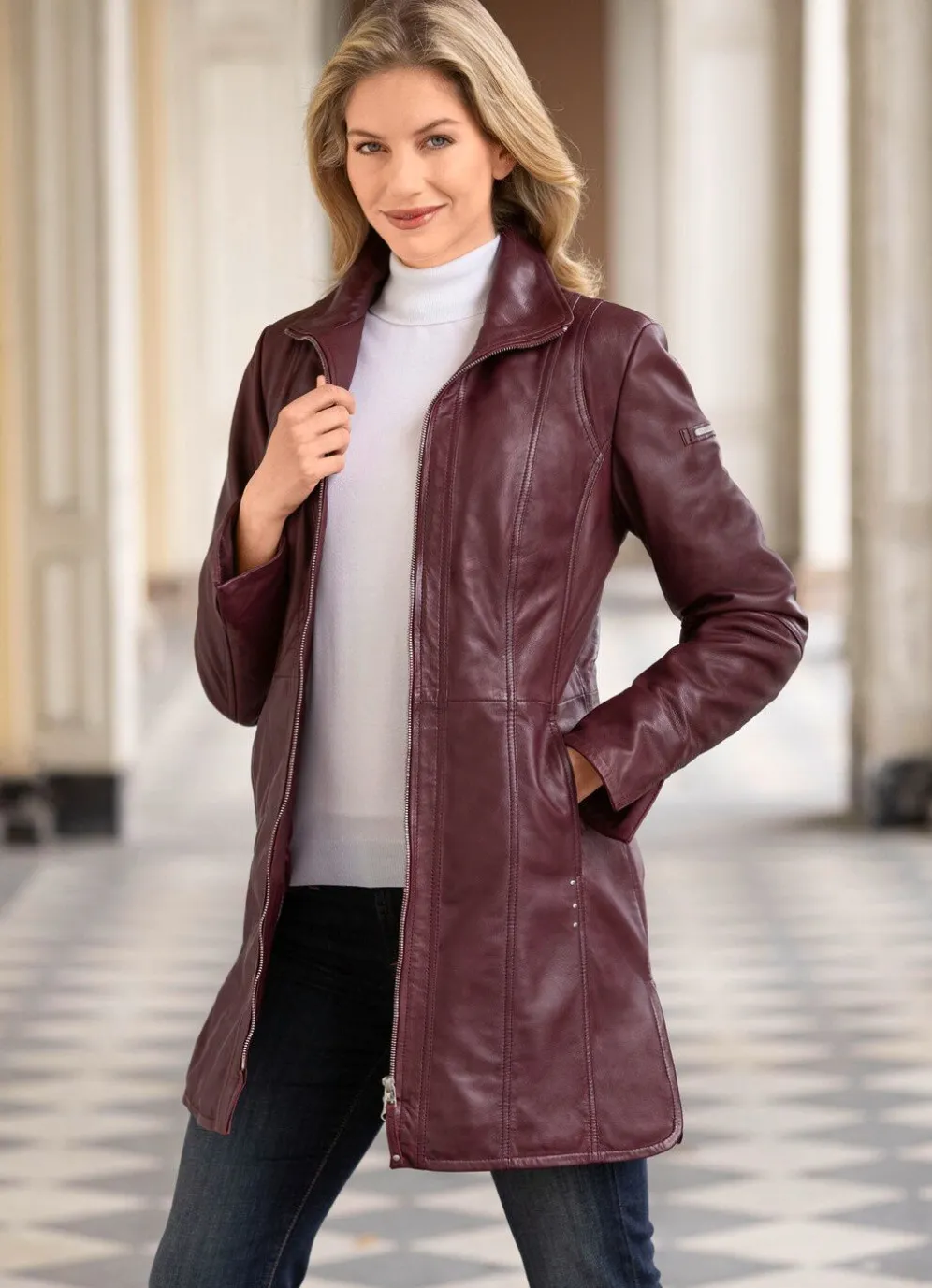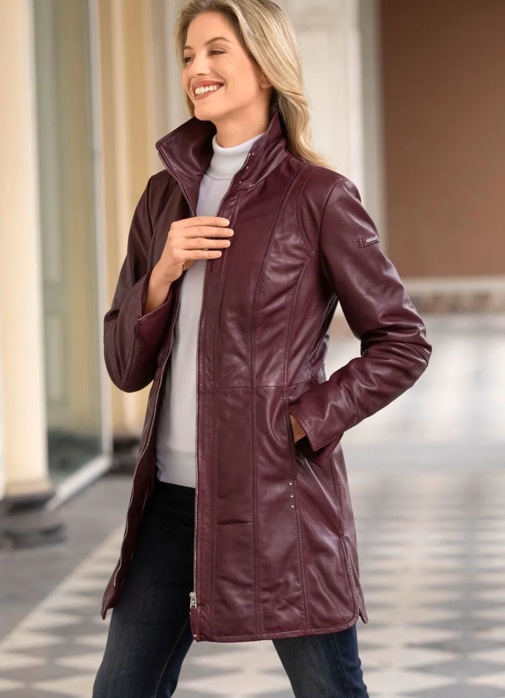 Stilsicherer Kurzmantel von „Cabrini“ aus weichem Lamm-Nappaleder, mit Steh-Umlegekragen, Nietenzier im Vorderteil und am Kragen, 2-Wege-Reißverschluss, Taschen mit Drucker, Seitenschlitze mit abgerundetem Saum, Ärmelabschlüsse mit Schlitz sowie zwei Innentaschen.