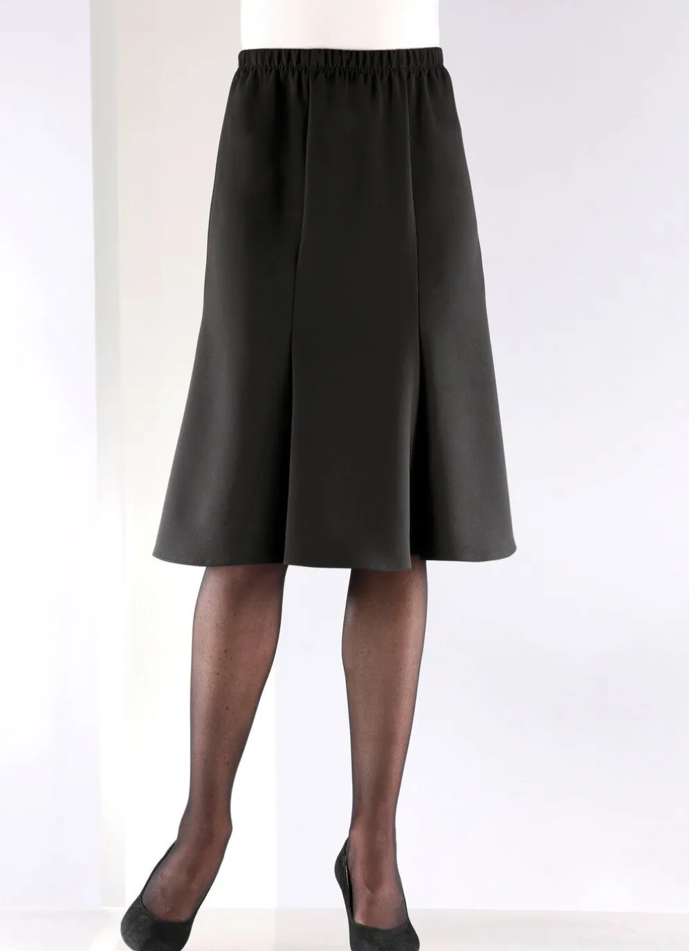 Ansprechender, leicht ausgestellter 6-Bahnenrock mit Dehnbund rundum. Gesamtlänge ca. 67 cm, bei K-Gr. ca. 63 cm.