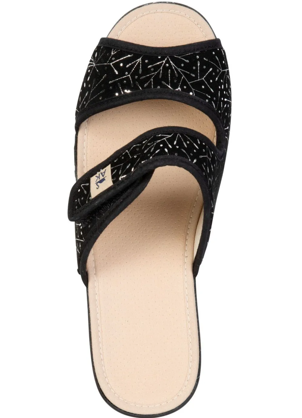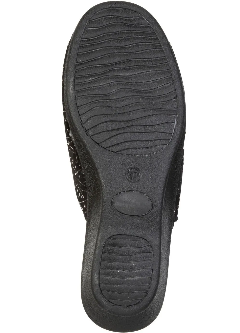 Pantoletten aus glänzend bedrucktem Nubukmaterial, mit angenehmer Polsterung und verstellbarer Klettspange: Textilfutter, gepolsterte Decksohle, Gummi-Laufsohle sowie 30 mm Keilabsatz