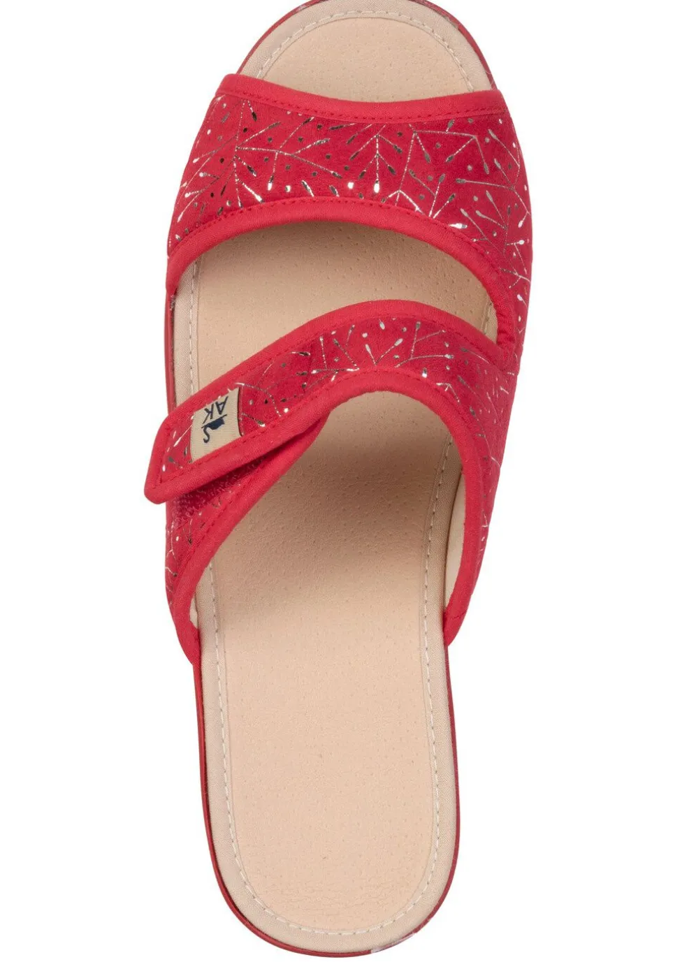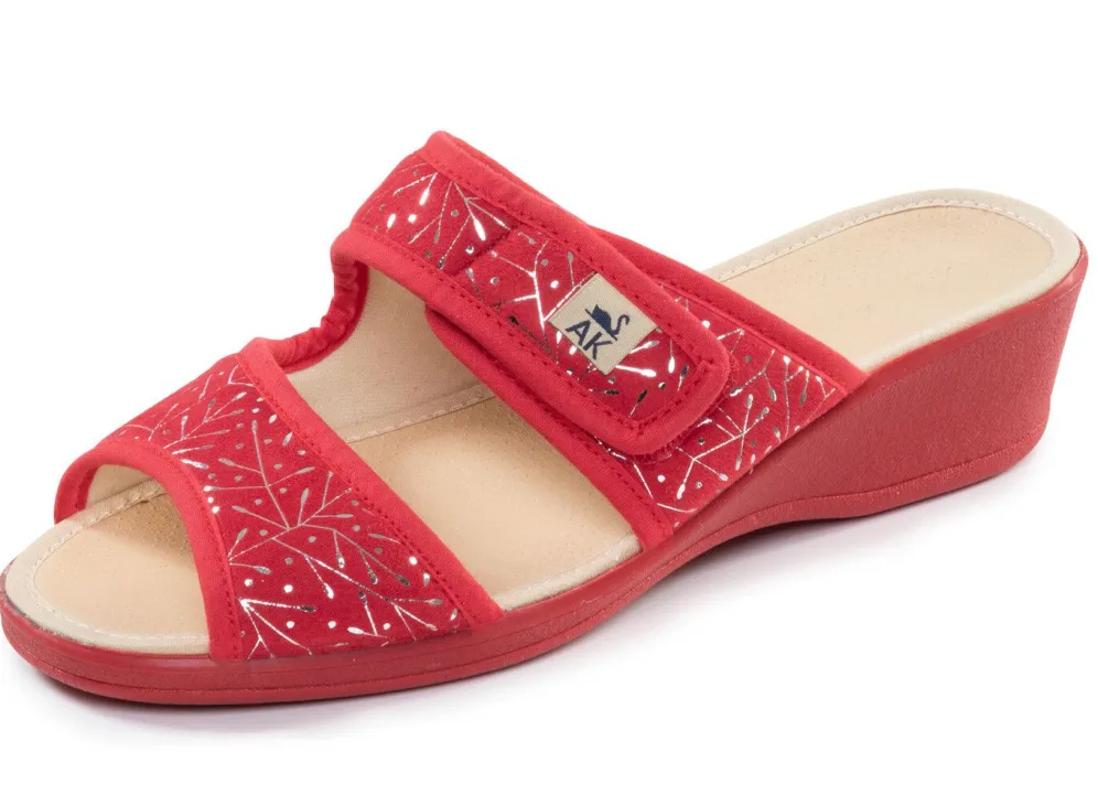 Pantoletten aus glänzend bedrucktem Nubukmaterial, mit angenehmer Polsterung und verstellbarer Klettspange: Textilfutter, gepolsterte Decksohle, Gummi-Laufsohle sowie 30 mm Keilabsatz