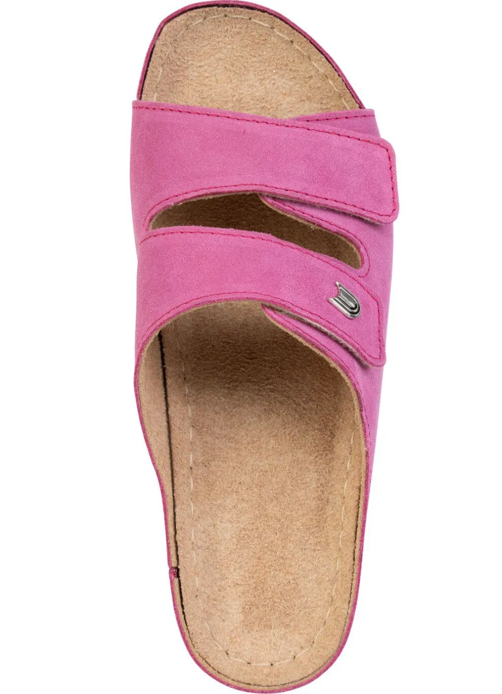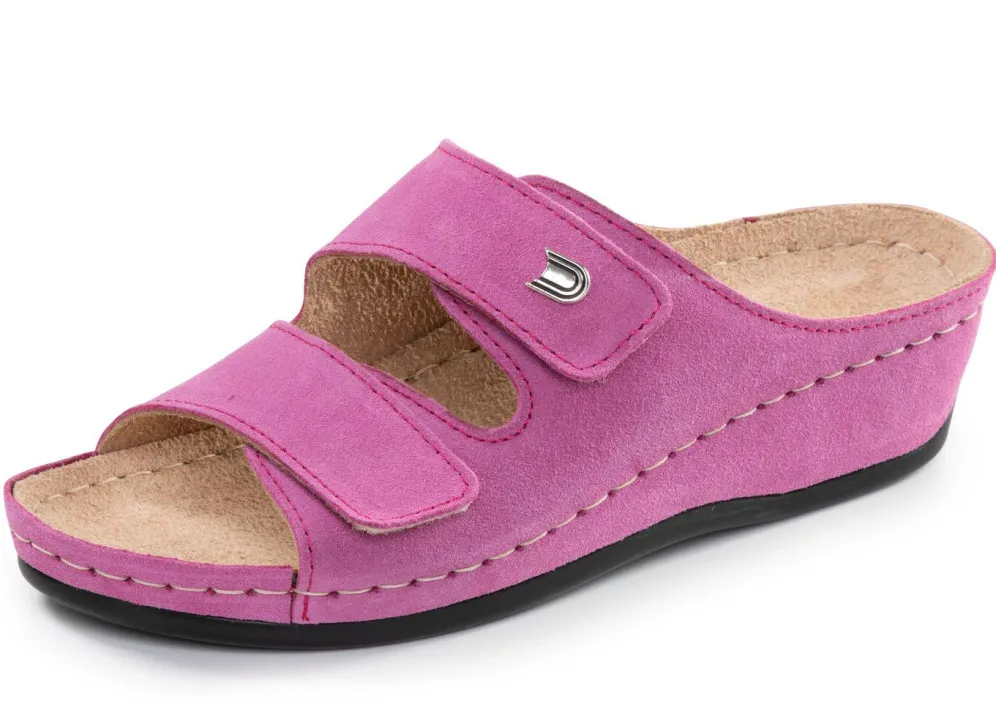 Pantoletten aus weichem Veloursleder: Weite G, zwei verstellbare Klettspangen, Lederfutter, gepolstertes Lederfußbett, leichte PU-Laufsohle sowie 30 mm Keilabsatz