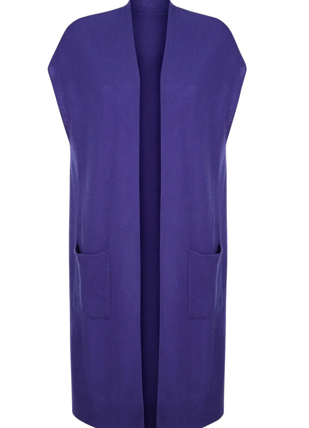 Verschlusslose Long-Strickweste mit überschnittener Schulterpartie, Seitenschlitzen sowie 2 aufgesetzten Taschen und Saum mit Rippenabschluss.