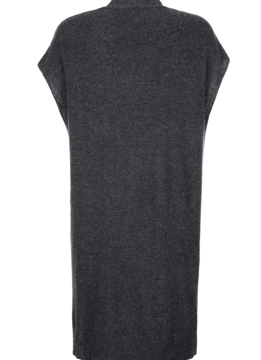 Verschlusslose Long-Strickweste mit überschnittener Schulterpartie, Seitenschlitzen sowie 2 aufgesetzten Taschen und Saum mit Rippenabschluss.