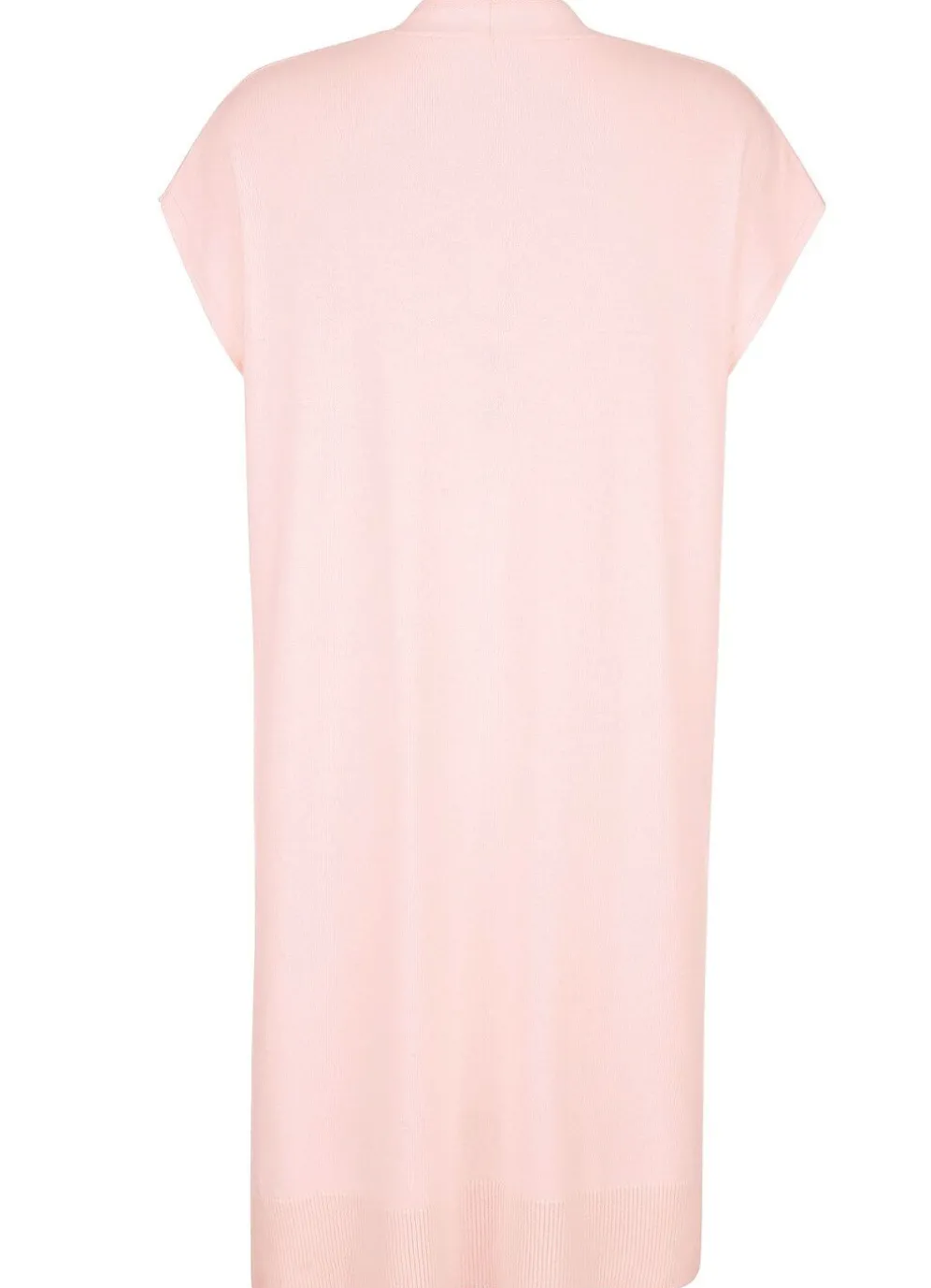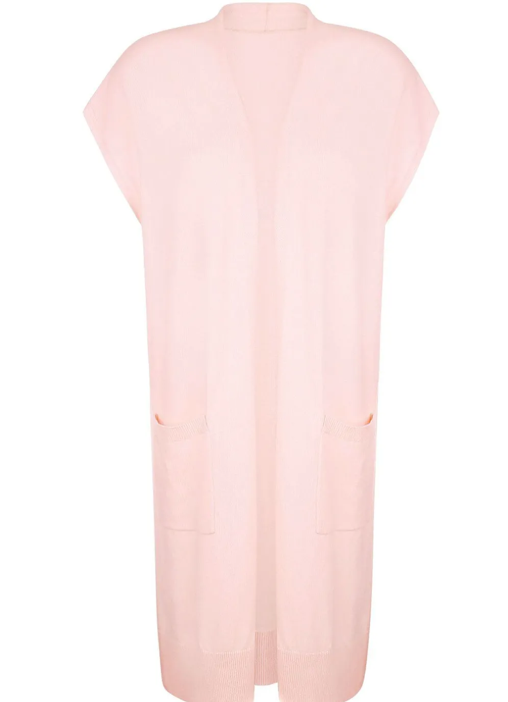 Verschlusslose, roséfarbene Long-Strickweste mit überschnittenen Schultern, gerippten Armausschnitten, Saum- sowie Taschenabschlüssen, 2 aufgesetzten Taschen und Seitenschlitzen.