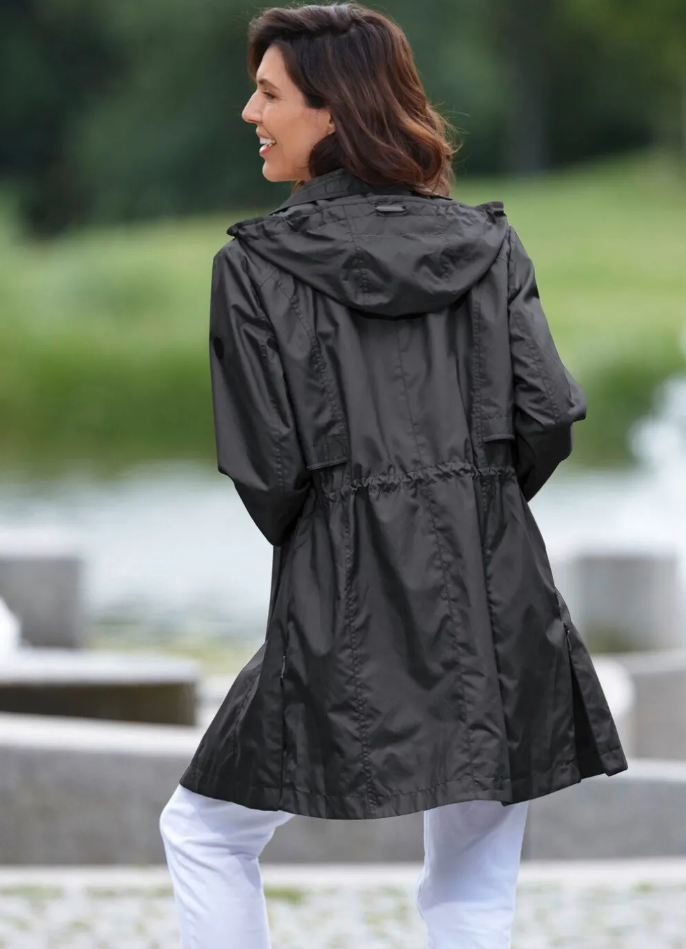 Bezaubernde Longjacke: Durchzugsband und Stopper in der Kapuze und in der Taille, durch Reißverschluss unter der Druckerleiste hoch schließbarer Stehkragen, Reißverschlusstaschen mit Patte und Drucker, umschlagbare Ärmel in Kontrast, Reißverschluss an den Seitenschlitzen sowie eine Innentasche. Länge ca. 86 cm, bei K-Gr. ca. 80 cm.