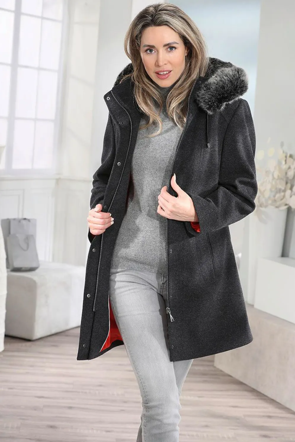 Ein modischer Volltreffer ist diese stilsichere Longjacke in Dunkelgrau, mit hohem Tragekomfort: abnehmbare Kapuze mit Durchzugsband, Stopper und abnehmbarem Kunstpelz-Besatz, durch Reiß-verschluss unter der Druckerleiste hoch schließbarer Stehkragen, Reißverschluss an den Paspeltaschen, eine Innentasche. Länge ca. 84 cm, ab Gr. 46 ca. 86 cm, bei K-Gr. ca. 80 cm, ab Gr. 23 ca. 82 cm.