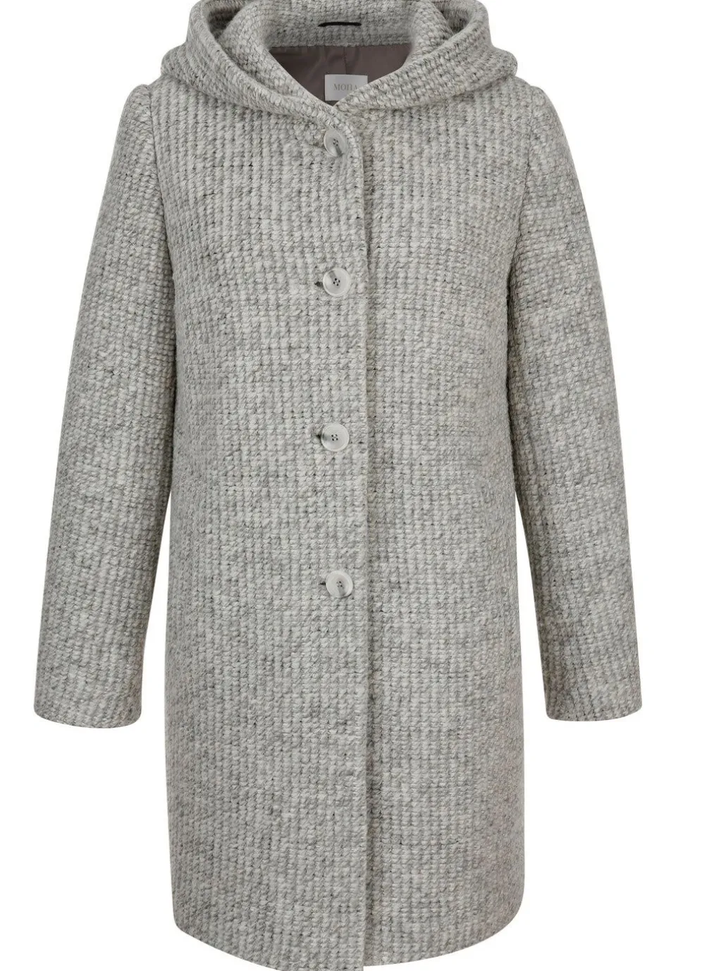 Longjacke mit fester Kapuze, Knopfleiste, Schubtaschen mit Blende sowie einer Innentasche. Länge ca. 84 cm. Die Qualität: Bicolorgewebe aus 52% Polyester, 26% Polyacryl und 22% Wolle; Taftfutter aus 100% Polyester